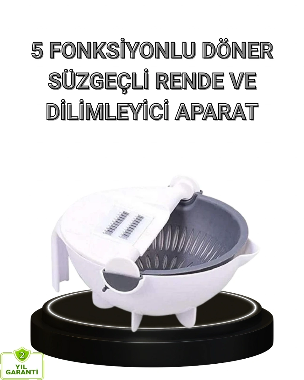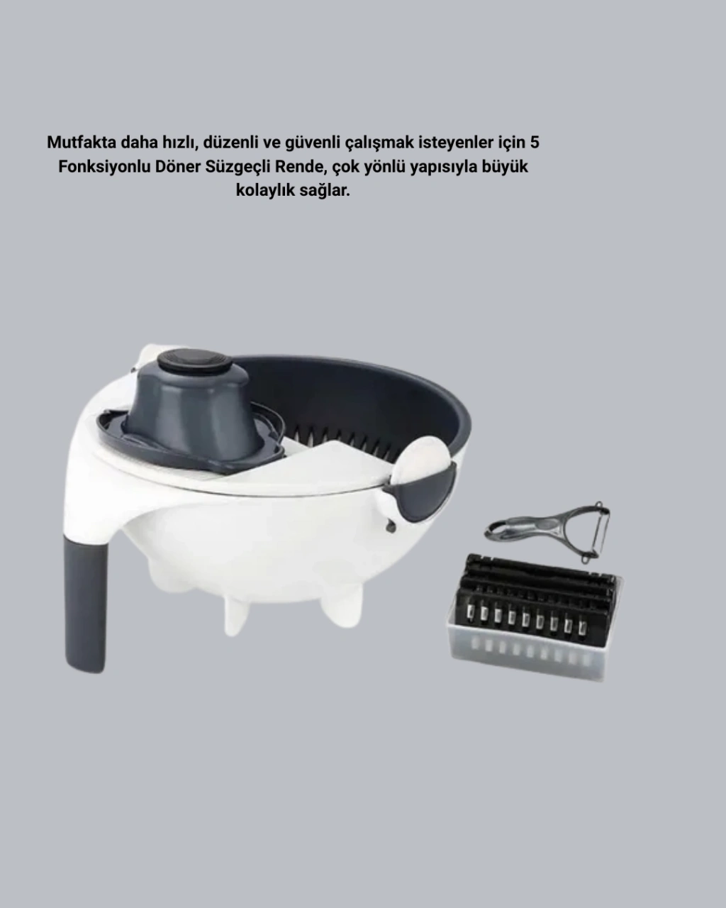 Mutfakta işlerinizi hızlandırmak ve çok daha düzenli bir çalışma alanı oluşturmak istiyorsanız, 5 Fonksiyonlu Döner Süzgeçli Rende tam size göre bir üründür. Hem profesyonel mutfaklarda hem ev kullanıcılarında tercih edilen bu cihaz, birçok işlemi tek üründe birleştirerek büyük kolaylık sunar.Döner mekanizması, farklı kesim bıçaklarını anında değiştirmenize imkân tanır. Böylece tek bir cihazla hem ince hem kalın rendeleme, hem şerit kesme hem de yuvarlak dilimleme yapabilirsiniz. Bu özellik, özellikle yemek hazırlığı sırasında zaman kaybını önler ve mutfakta daha verimli çalışmanıza yardımcı olur.Hazne kısmı, doğranan yiyeceklerin dağınıklık oluşturmamasını sağlar. Ayrıca bu hazne süzgeç görevi de görür; sebzeleri doğradıktan sonra hemen su altında yıkayabilir ve pratik şekilde süzebilirsiniz. Bu çift fonksiyon, mutfakta kullanılan araç sayısını azaltarak işlerinizi kolaylaştırır.Kullanım güvenliği için tasarlanmış kaymaz taban, ürünün sabit durmasını sağlar ve işlem sırasında kaymasını engeller. El koruma aparatı ise bıçaklara yakın çalışırken maksimum güvenlik sunar. Bu sayede olası kesiklerin önüne geçilir.Ürünün kompakt tasarımı yer kaplamaz ve saklamayı kolaylaştırır. Parçalarının kolayca ayrılabilir olması, temizlik sürecini oldukça pratik hale getirir. İster elinizde yıkayın ister su altında durulayın, hijyenik kullanım her zaman mümkündür.Paslanmaz çelik bıçakları uzun süre keskinliğini korur ve yüksek performans sunar. Sağlam plastik gövde, gıda ile temasa uygun yapıda olup sağlıklı bir kullanım sağlar. Ürün, salata hazırlama, sebze doğrama, sos hazırlama, garnitür kesme ve daha birçok mutfak işleminde hızlı bir yardımcıdır.Bu 5 fonksiyonlu döner rende, mutfakta pratiklik ve düzen arayan herkes için vazgeçilmez bir araçtır.