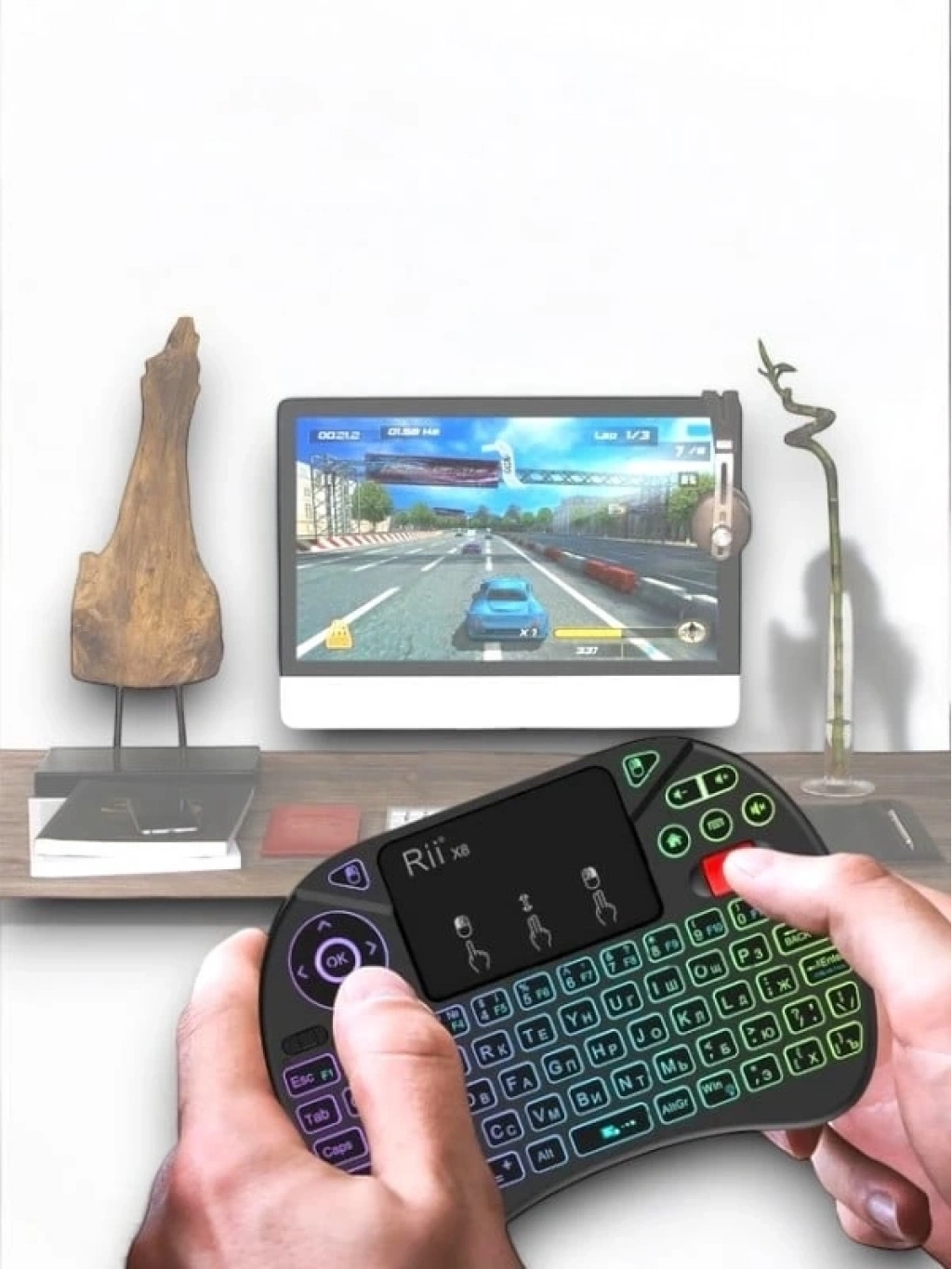 Mini Klavye Işıklı Kablosuz Mini Klavye SmartTV Televizyon PS3 Dokunmatik Mouse Mini Kablosuz Dokunmatik Klavye Mouse 3 Renk olarak klavye ışıklıdır. Işığını açmak için FN + F2 tuşuna basarak renkler arasında geçiş yapabilirsiniz. Bilgisayarınıza, akıllı telefonunuza, tabletinize, televizyonunuza bağlanır. Ufacık boyutu ile yanınızda her yere taşıyabilirsiniz. Kullanımı kolaydır, kaliteli plastikten üretilmiştir. Sadece siyah mevcuttur. 2.4 GHz kablosuz bağlantı ile 10 metreye kadar kullanılabilir. Ürün Pillidir Dahili bataryası içinde mevcuttur. Windows, Android, Mac, Linux destekler PS3, XBOX360 destekler Özellikleri Voltaj: 3.3 V Çalışma akımı: 50mA Frekans: 2.4 GHz Kullanım mesafesi: 10 metreye kadar Ağırlık: 92gr (pilsiz) Boyutları: 14.7x9.8x2cm Kutu İçeriği 1 adet mini klavye 1 adet kullanım klavuzu 1 adet USB verici (klavyenin pil girişinin içindedir.)Kutu İçeriği 1 adet mini klavye 1 adet kullanım klavuzu 1 adet USB verici (klavyenin pil girişinin içindedir.)