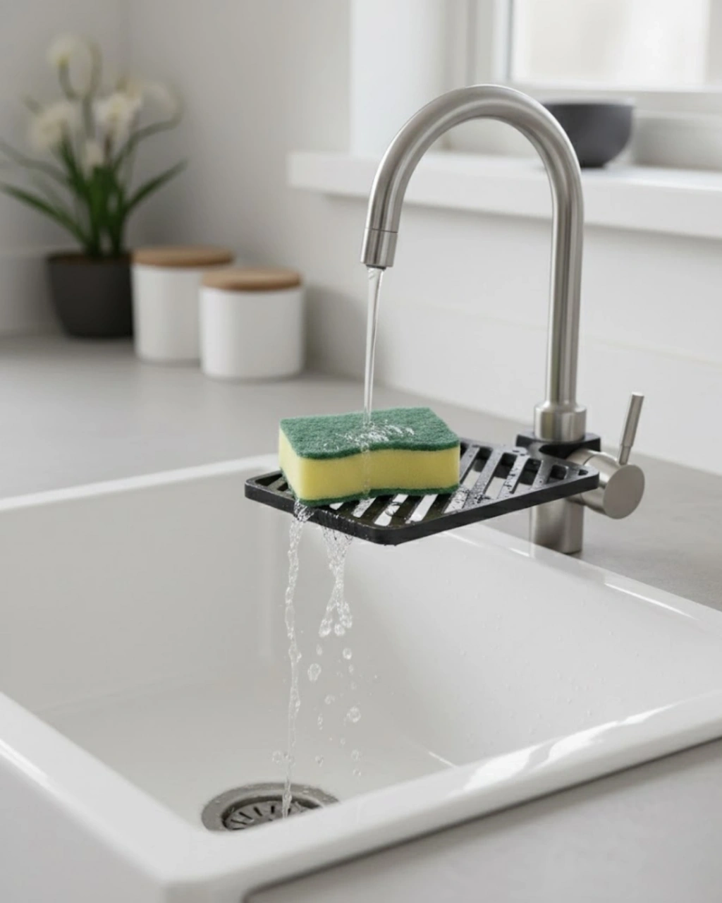 musluk organizeri, mutfakta hem hijyen hem de kullanım kolaylığı arayanlar için tasarlanmış fonksiyonel bir çözümdür. Süngerlerin sürekli ıslak kalması, bakteri oluşumu ve kötü koku gibi sorunlara yol açabilir. Bu ürün, süngerinizi musluğun gövdesine entegre platform üzerinde konumlandırarak bu sorunları ortadan kaldırmayı amaçlar.Organizerin en önemli özelliği, alt kısmında bulunan drenaj kanallarıdır. Sünger yıkandıktan sonra üzerinde kalan su, bu kanallar sayesinde doğrudan lavaboya akar. Böylece sünger daha hızlı kurur ve hijyenik kalır. Tezgâhla temas etmediği için hem mutfak yüzeyiniz temiz kalır hem de süngeriniz daha sağlıklı bir şekilde muhafaza edilir.Musluğa monte ve birleşik yapısı sayesinde ürün sabit durur, sallanmaz ve kullanım sırasında güven verir. Ekstra montaj, yapıştırıcı veya askı gerektirmez. Mutfakta sade ve düzenli bir görünüm elde etmek isteyenler için ideal bir çözümdür. Özellikle minimal mutfak tasarımlarında alan kazanımı sağlar.Şık ve modern tasarımıyla mutfak dekorasyonunu tamamlayan bir aksesuardır. Günlük yoğun kullanıma uygun dayanıklı yapısı sayesinde uzun ömürlüdür. Sünger değiştirme ve temizleme işlemleri son derece pratiktir.Bu musluk organizeri, mutfakta küçük ama etkili bir düzen sağlayarak günlük bulaşık ve temizlik işlerinizi daha konforlu hale getirir. Hijyen, düzen ve kullanım kolaylığını bir arada sunan pratik bir mutfak yardımcısıdır.