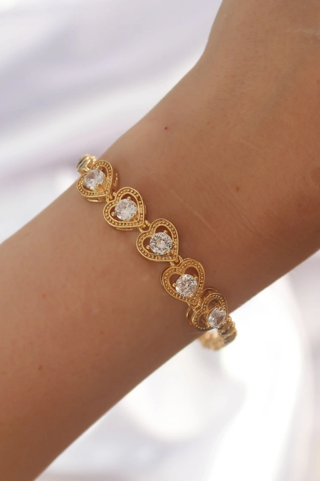 ® Pirinç Gold Renk İçi Zirkon Taşlı Kalp Figürlü Bileklik