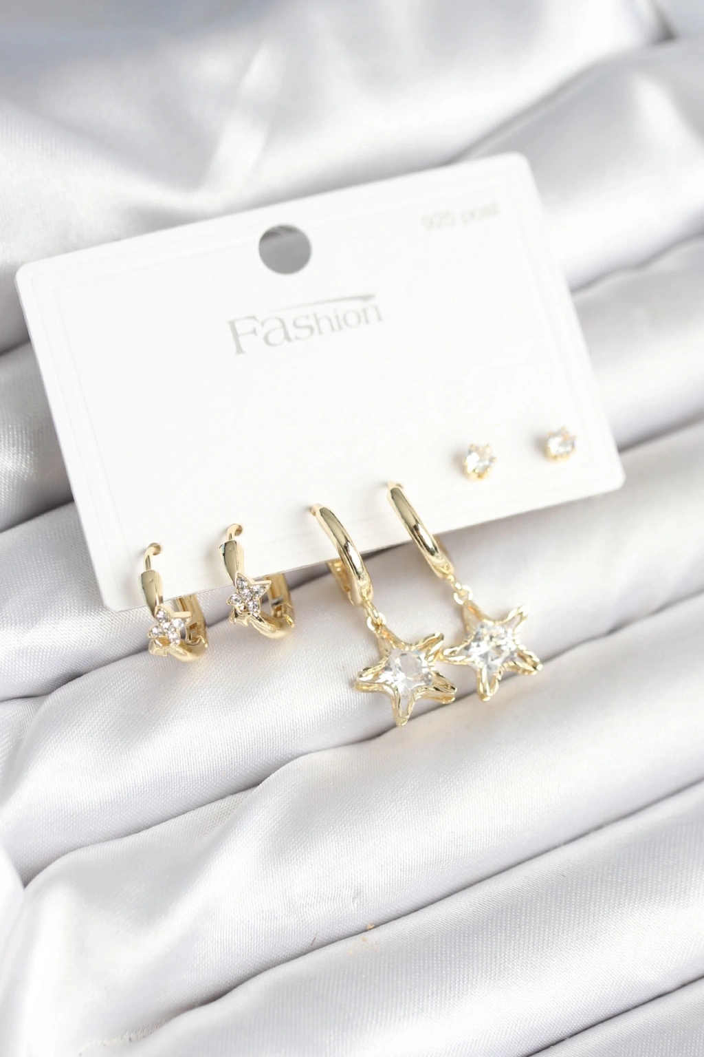® Pirinç Gold Renk Yıldız Model 925 Gümüş Çivili Kadın Küpe Seti
