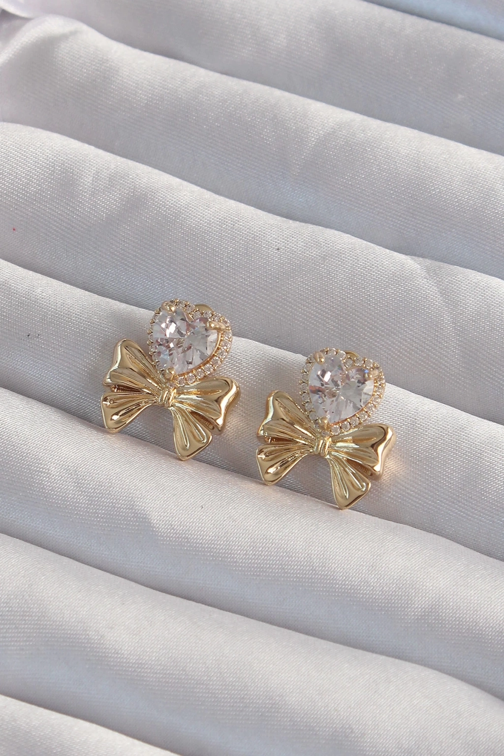 ® Pirinç Gold Renk Zirkon Taşlı Kalp Model Fiyonk Küpe