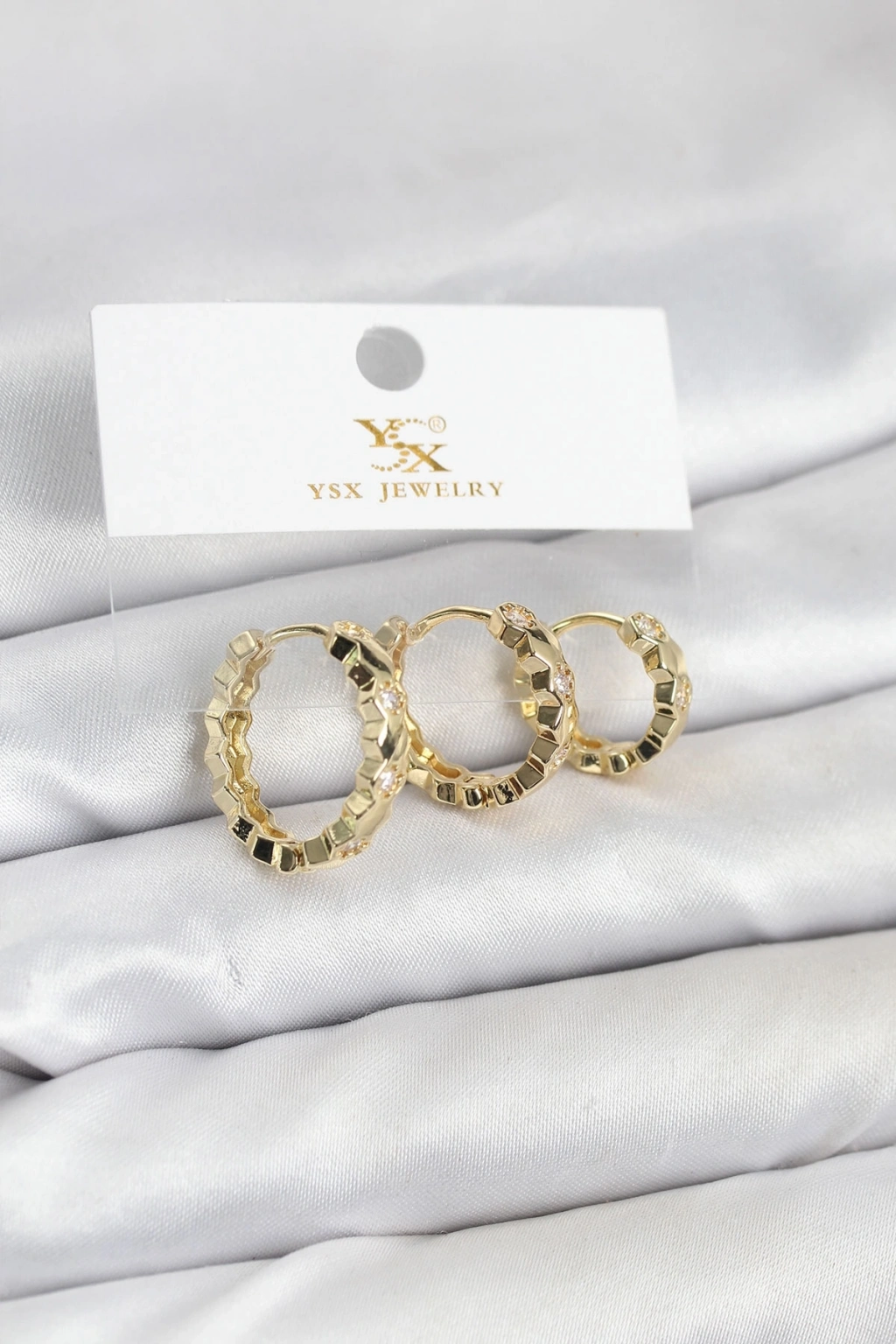 ® Pirinç Gold Renk Zirkon Taşlı Petek Halka Model YSX Trio Küpe Seti