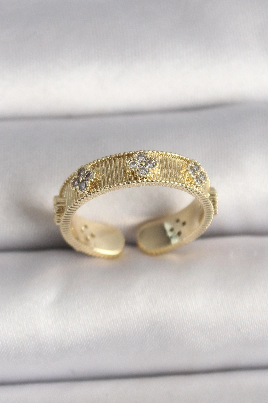 ® Pirinç Gold Renk Zirkon Taşlı Yonca İşlemeli Ayarlanabilir Yüzük