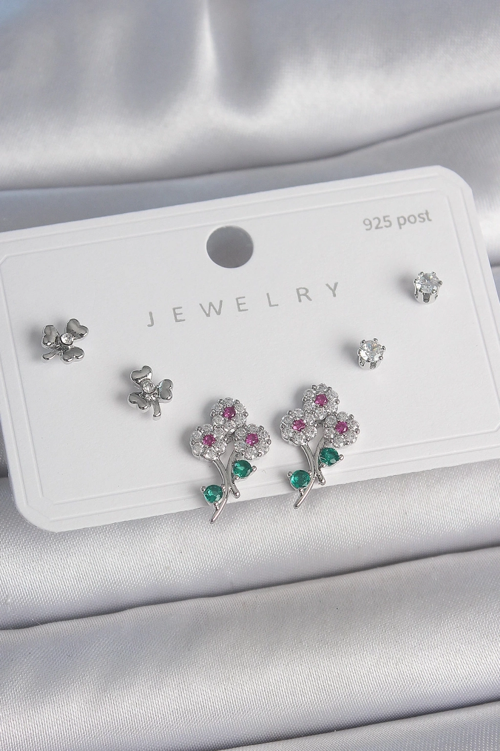 ® Pirinç Gümüş Renk Renkli Zirkon Taşlı Çiçek Model Yaprak Detay 925 Ayar Gümüş Çivi Kadın Küpe Seti