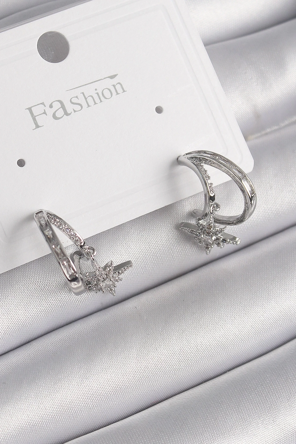 ® Pirinç Gümüş Renk Zirkon Taşlı Halka Model Sallantı Yıldız Detay Kadın Küpe