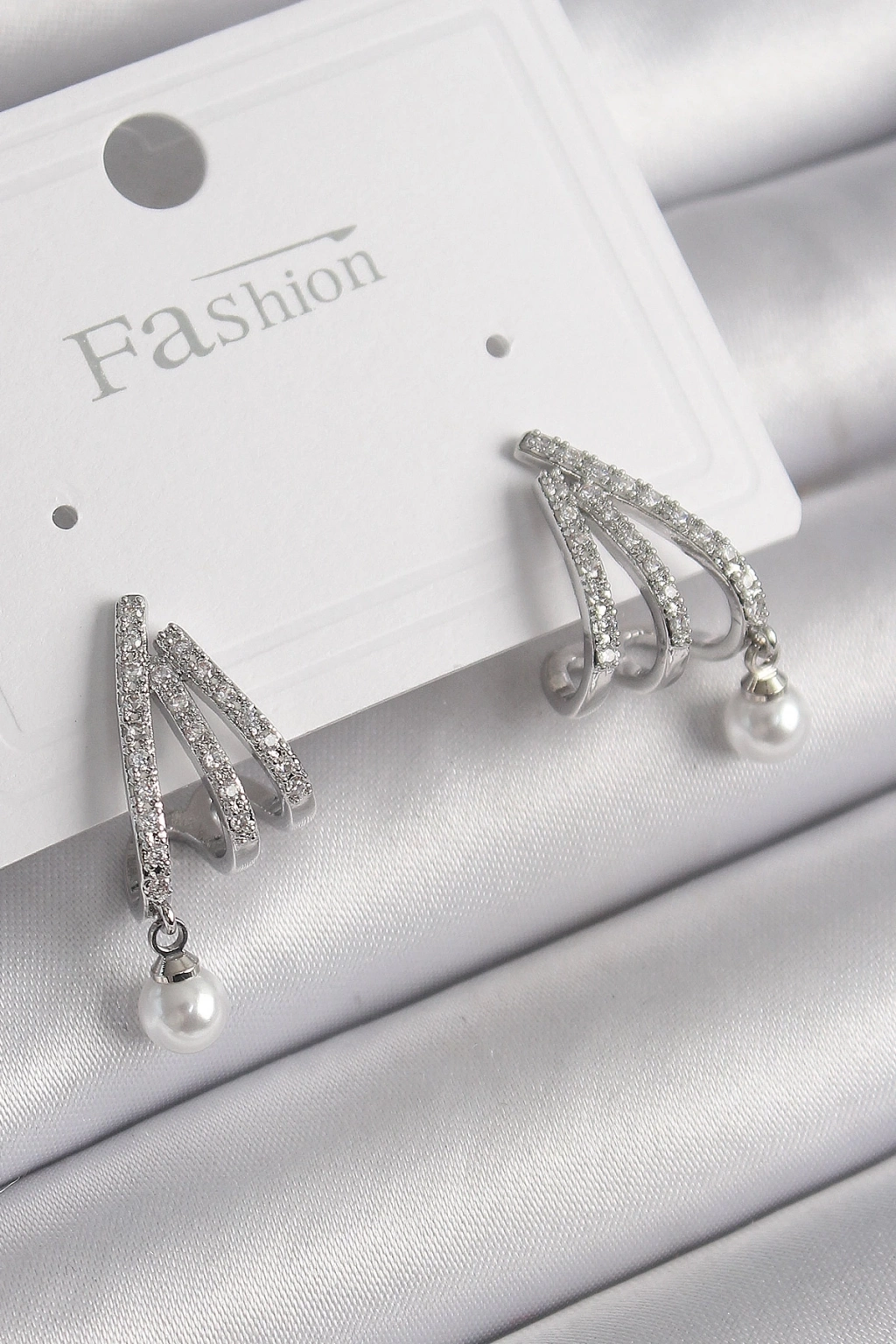 ® Pirinç Gümüş Renk Zirkon Taşlı Pençe Model İnci Detay Kadın Küpe