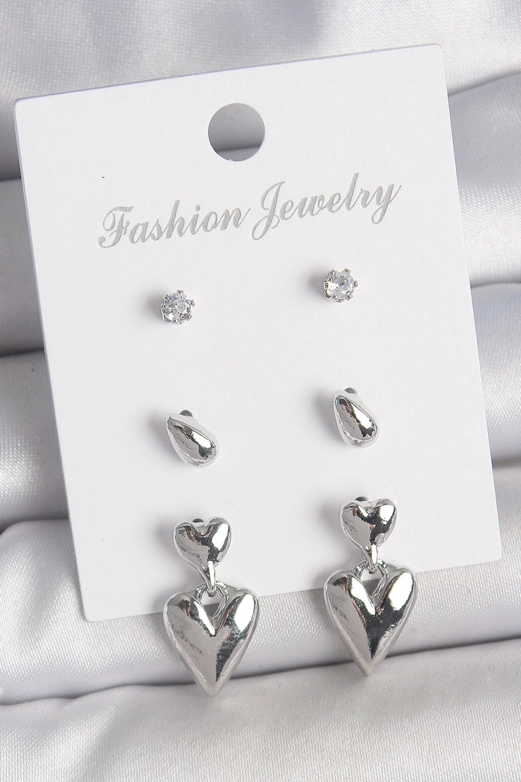 ® Pirinç Gümüş Renk Zirkon Taşlı Sallantılı Kalp Model 3 Çift Kadın Küpe Seti