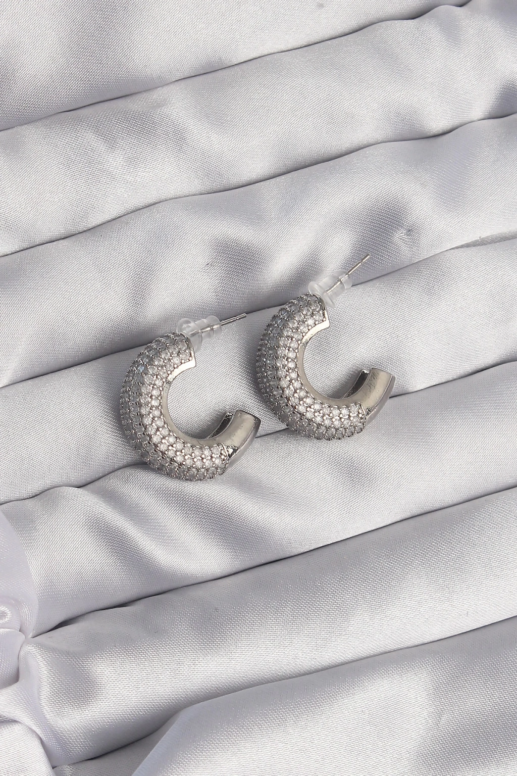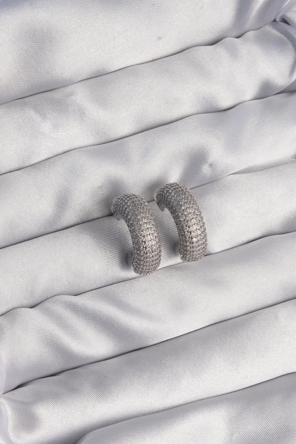 ® Pirinç Gümüş Renk Zirkon Taşlı Yarım Halka Küpe