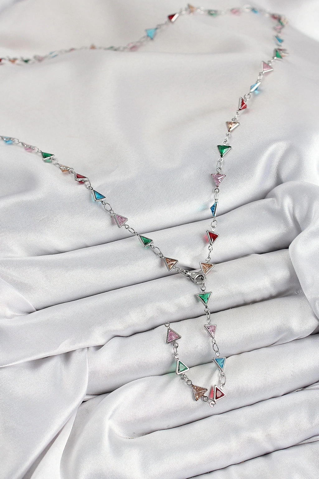 ® Pirinç Renkli Zirkon Taşlı Üçgen Model Gümüş Renk Kadın Y Kolye