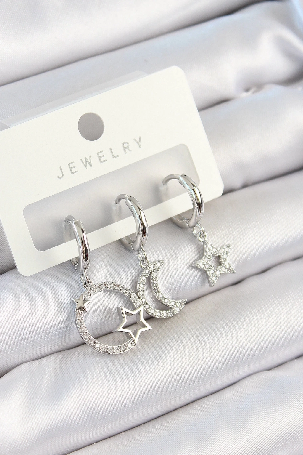 ® Pirinç Zirkon Taşlı Ay Ve Yıldız Model Gümüş Renk 3'lü Çift Kadın Küpe Set