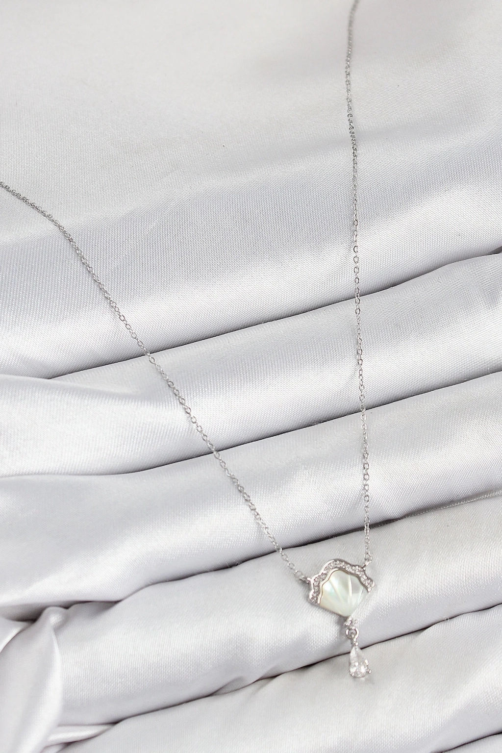 ® Pirinç Zirkon Taşlı İstiridye Model Gümüş Renk Kadın Kolye