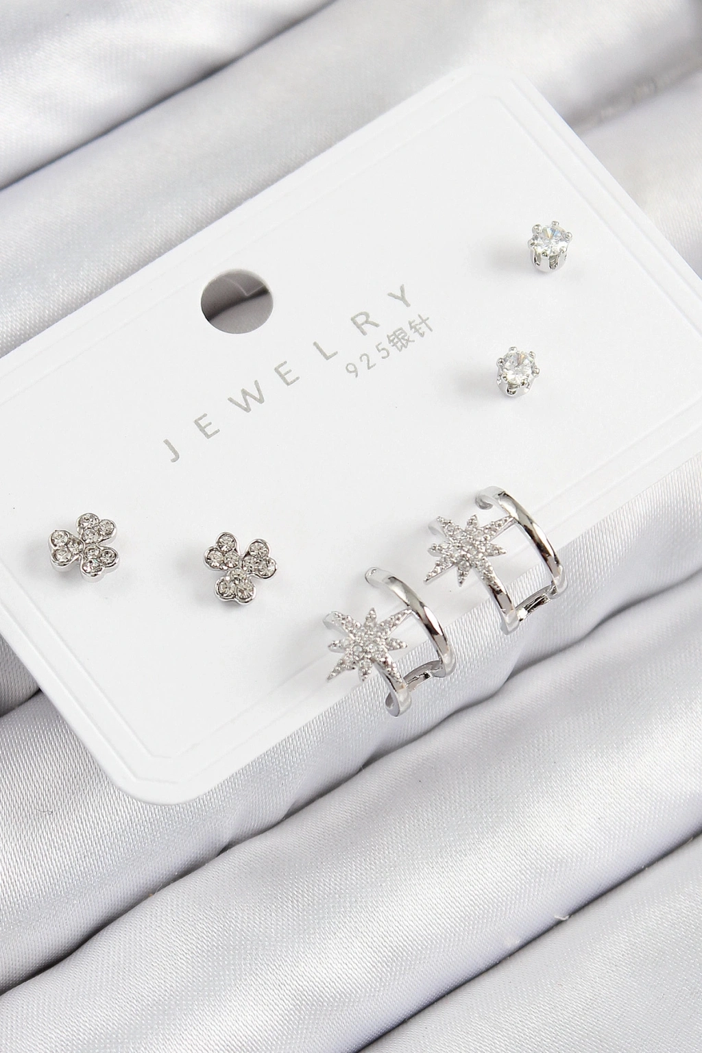® Pirinç Zirkon Taşlı Kutup Yıldızı Model Gümüş Renk 925 Ayar Gümüş Çivi Kadın Küpe Set
