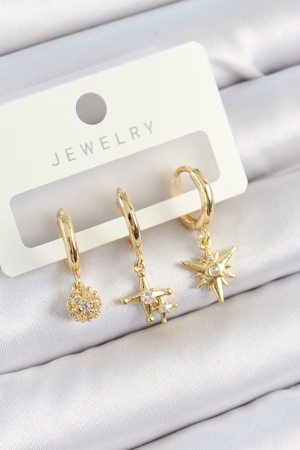 ® Pirinç Zirkon Taşlı Yıldız Model Gold Renk 3'lü Çift Kadın Küpe Set