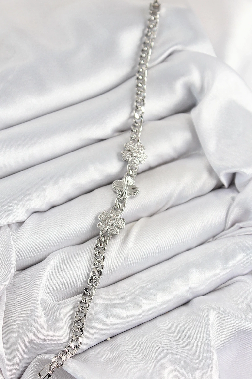 ® Pirinç Zirkon Taşlı Yonca Model Gümüş Renk Kadın Bileklik