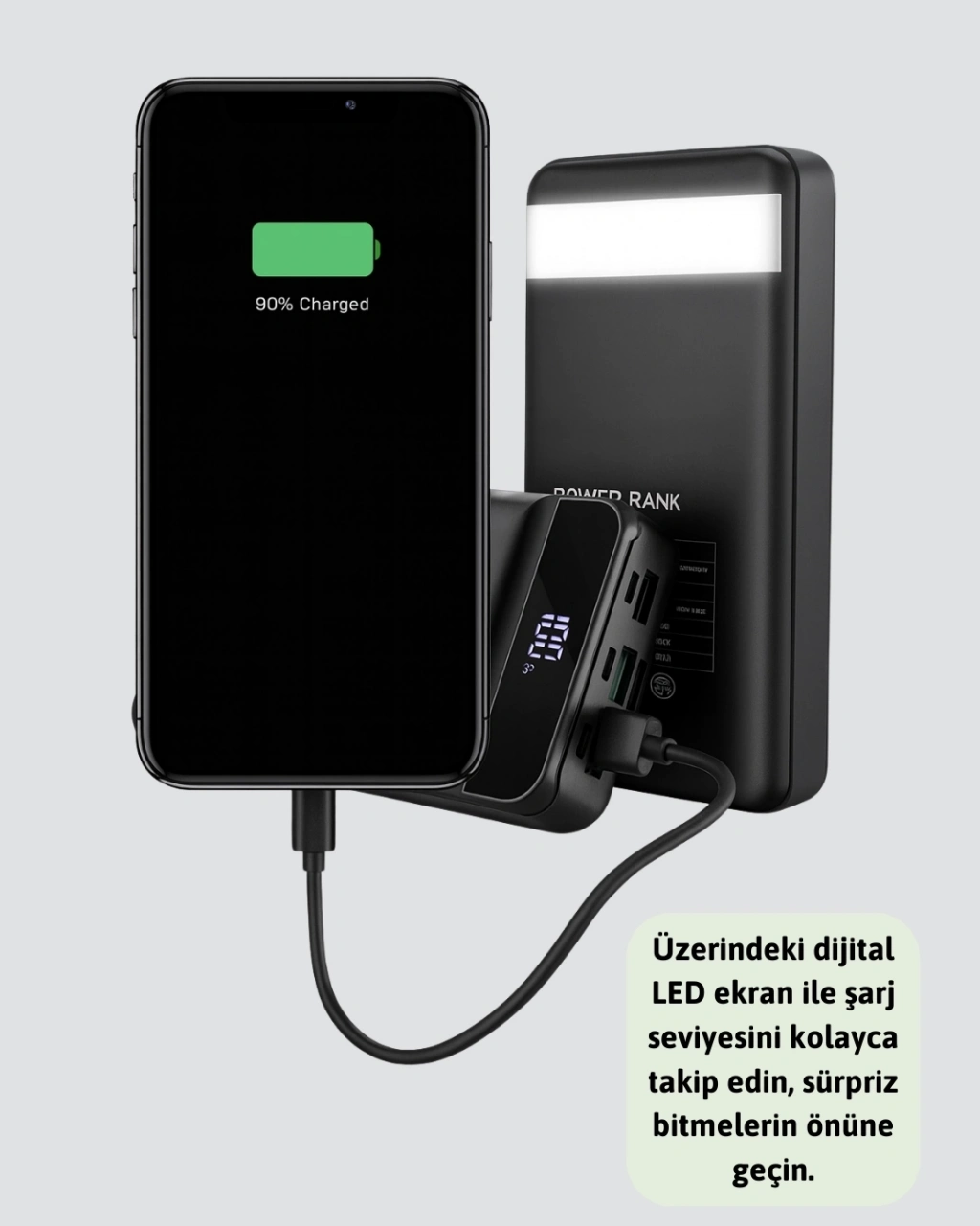 Modern tasarımı ve ultra güçlü kapasitesiyle öne çıkan 50.000 mAh powerbank, günlük şarj ihtiyacınız için mükemmel bir çözümdür. Aynı anda 4 cihazı şarj edebilme özelliği, yoğun yaşam temposunda zamandan tasarruf sağlar. Akıllı telefonlardan tabletlere, kulaklıklardan kameralara kadar pek çok cihazla uyumlu olan bu ürün, Type-C, Lightning ve Micro USB giriş seçenekleri ile geniş kullanım imkanı sunar. LED dijital ekran, şarj seviyesini kolayca takip etmenizi sağlar. Ultra hızlı şarj desteği, cihazlarınızı kısa sürede kullanıma hazır hale getirirken, akıllı güvenlik sistemi aşırı akım, aşırı ısınma ve kısa devre gibi durumlara karşı koruma sağlar. Kompakt boyutları sayesinde kolayca taşınabilir, işte, okulda, seyahatte veya günlük yaşamda her an yanınızda bulundurabilirsiniz. Dayanıklı gövde yapısı uzun ömürlü kullanım imkanı sunarken, entegre LED ışığı karanlık ortamlarda ek aydınlatma sağlar. 50.000 mAh kapasitesi ile günlerce şarj derdi yaşamadan tüm cihazlarınızı güvenle şarj edebilirsiniz. Hem pratik hem güvenli bir enerji çözümü arayanlar için ideal bir üründür.