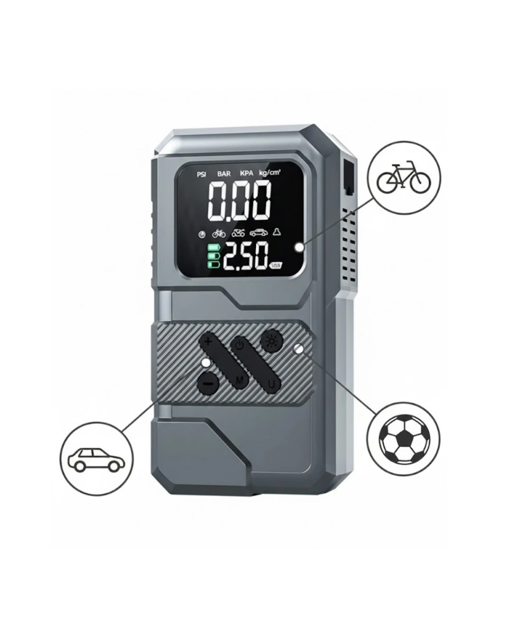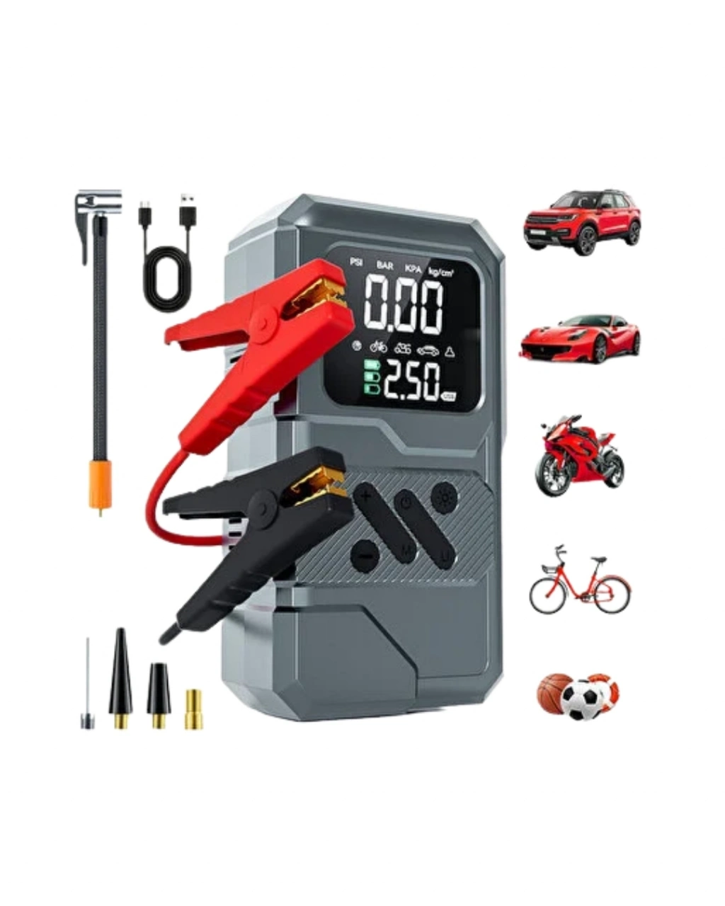 Çok fonksiyonlu yapısıyla öne çıkan bu taşınabilir cihaz, araç kullanıcılarının farklı ihtiyaçlarını tek bir ürünle karşılamayı hedefler. Akü takviye, lastik şişirme, LED aydınlatma ve powerbank özellikleri sayesinde sürücülere pratik çözümler sunar. 12.000 mAh kapasiteli bataryası, günlük kullanımda ve acil durumlarda yeterli enerji desteği sağlar.Akü takviye fonksiyonu, 12V araçlarla uyumlu olacak şekilde tasarlanmıştır. Uzun süre kullanılmayan araçlarda veya soğuk hava koşullarında yaşanabilecek akü problemlerinde destekleyici bir rol üstlenir. Lastik şişirme özelliği, dijital hava kompresörü sayesinde hassas basınç ayarı yapılmasına olanak tanır. Bu sayede lastiklerin ideal basınç seviyesinde tutulması kolaylaşır ve sürüş güvenliği desteklenir.LED aydınlatma sistemi, gece ve düşük ışık koşullarında kullanım kolaylığı sağlar. Yol kenarında yapılan müdahalelerde ortamın aydınlatılmasına yardımcı olurken, acil durumlarda fark edilirliği artırır. Powerbank özelliği ile telefon ve diğer elektronik cihazların şarj edilmesi mümkündür. Bu fonksiyon, özellikle uzun yolculuklarda büyük bir avantaj sağlar.Kompakt tasarımı sayesinde araç içerisinde az yer kaplar ve kolayca taşınabilir. Dayanıklı gövde yapısı, ürünü uzun süreli kullanıma uygun hale getirir. Taşıma kesesi ile birlikte sunulması, düzenli ve güvenli bir kullanım imkânı sağlar. Hem şehir içi hem de uzun yolculuklarda araç kullanıcıları için pratik bir yardımcıdır.