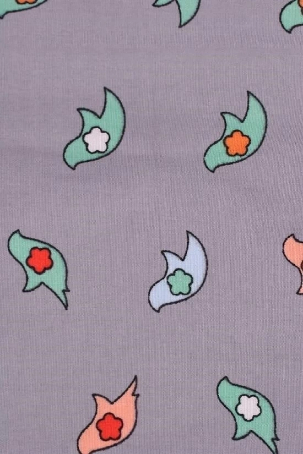 Gri kumaş zemini üzerine renkli kuş baskıları vardır