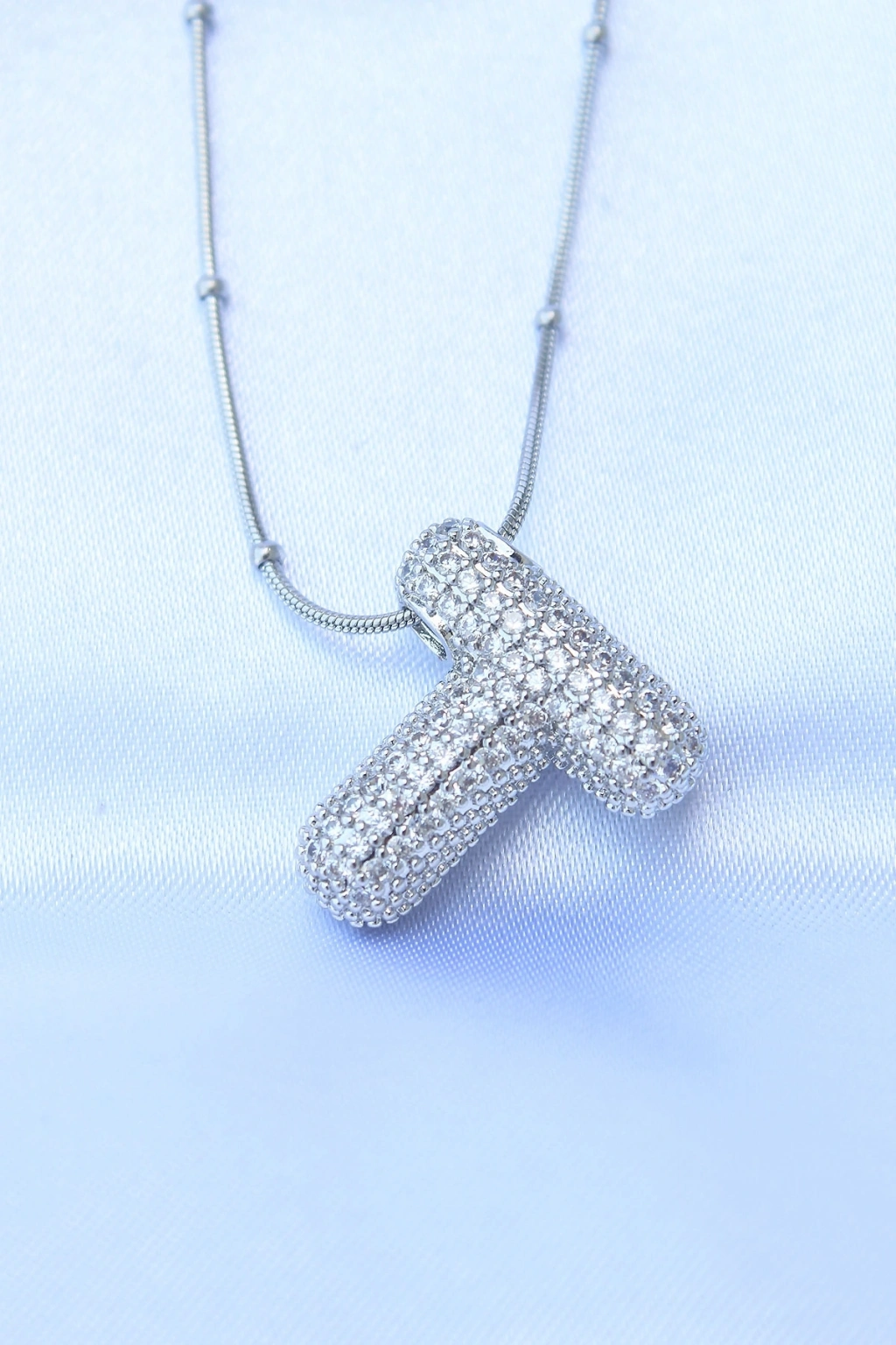 ® 316L Çelik Zincirli Zirkon Taşlı T Harfli Gümüş Renk Bubble Kolye