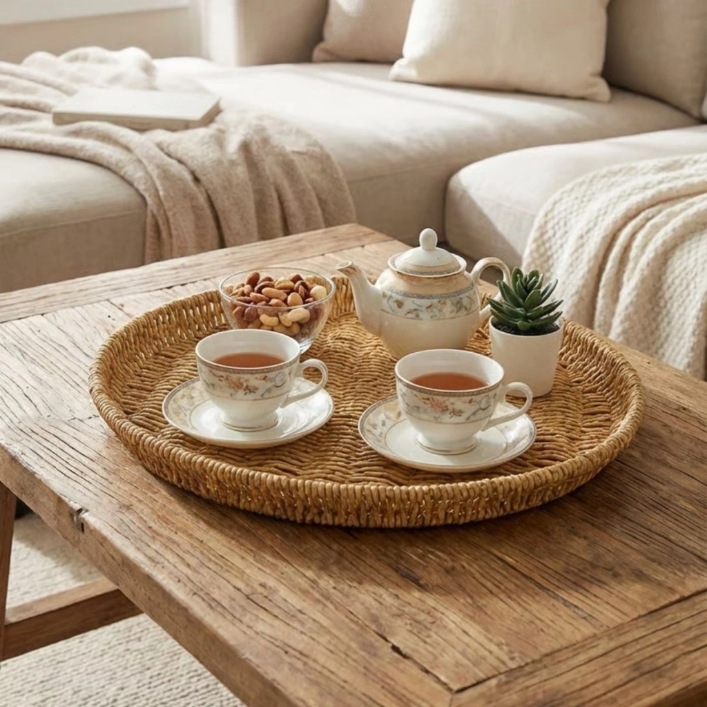 Dekoratif tasarımı sayesinde yalnızca servis tepsisi olarak değil; aynı zamanda masaüstü organizeri, salon ve mutfakta düzenleyici bir yardımcı olarak da öne çıkar. Islak alanlara uygun yapısı sayesinde kolay temizlenir ve hijyenik kullanım sağlar.
