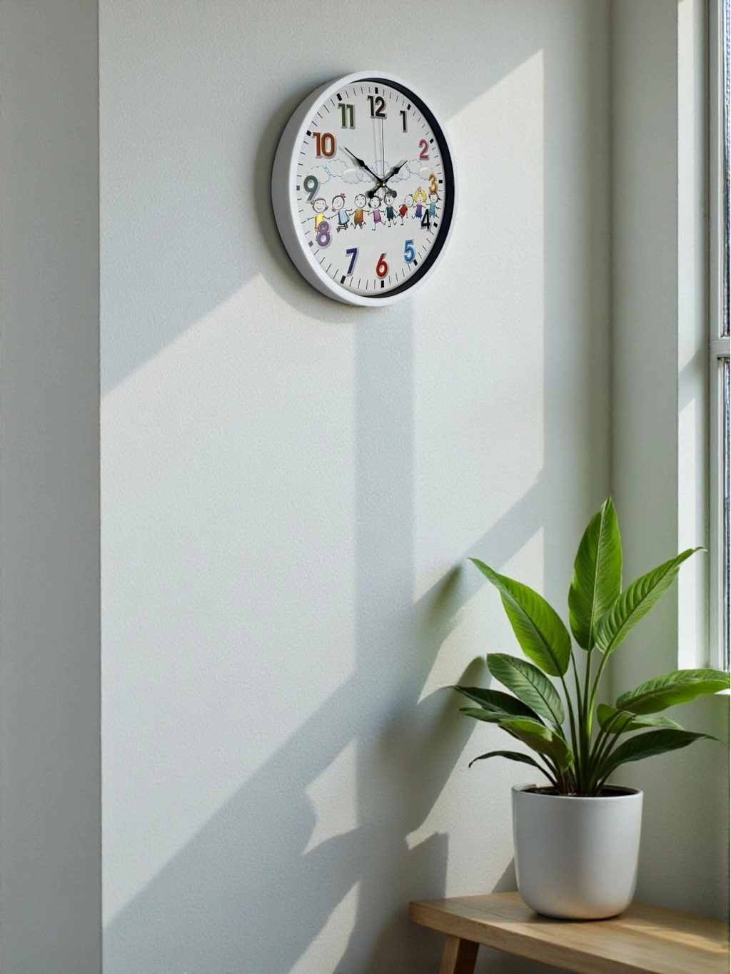 Renkli rakamları ve neşeli çocuk figürleriyle tasarlanan bu 36 cm çocuk odası duvar saati, miniklerin odasına hem eğlence hem de düzen katar.
