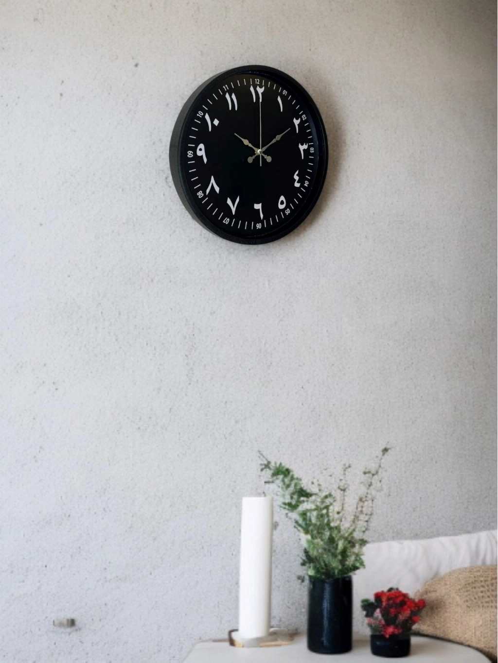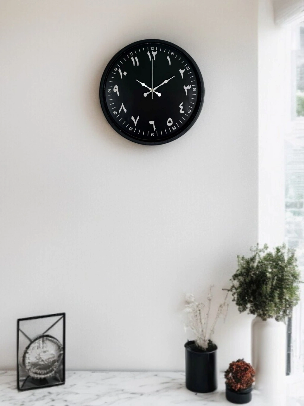 Siyah kadranı üzerinde yer alan beyaz Arapça rakamlarıyla tasarlanan bu 36 cm duvar saati, klasik çizgileri modern bir yorumla sunar. Arapça rakam kullanımı saate farklı bir karakter kazandırırken, beyaz rakamların siyah zeminle oluşturduğu kontrast sayesinde yüksek okunurluk sağlar.