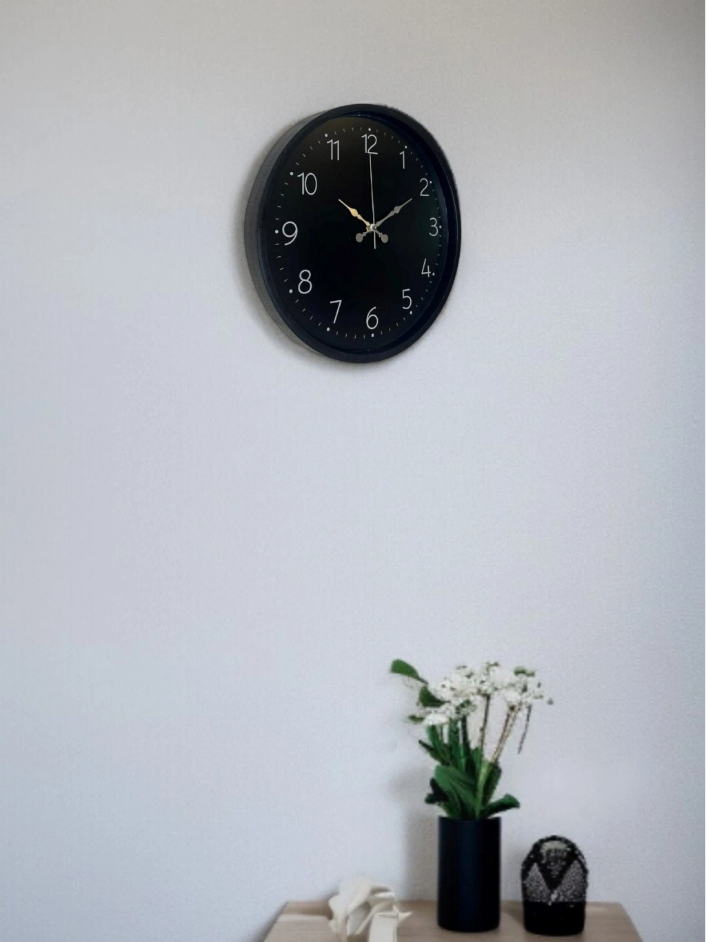Mat siyah kadranı ve sade rakam tasarımıyla öne çıkan bu 36 cm duvar saati, modern yaşam alanları için şıklık ve fonksiyonelliği bir arada sunar. Beyaz rakamları ve zarif akrep-yelkovan yapısı sayesinde saat, uzaktan dahi kolayca okunur.