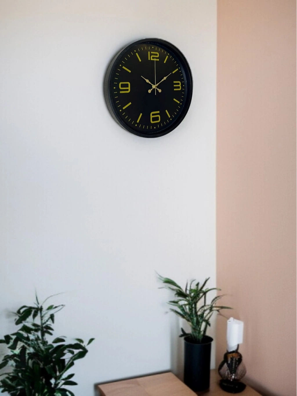 Siyah çerçevesi ve mat siyah kadranı üzerinde yer alan gold tonlu rakam ve indeksleri ile tasarlanan bu 36 cm duvar saati, modern ve şık bir duruş sunar. Minimal çizgilerle tasarlanmış kadranı, sade ama etkileyici bir dekoratif görünüm sağlar.