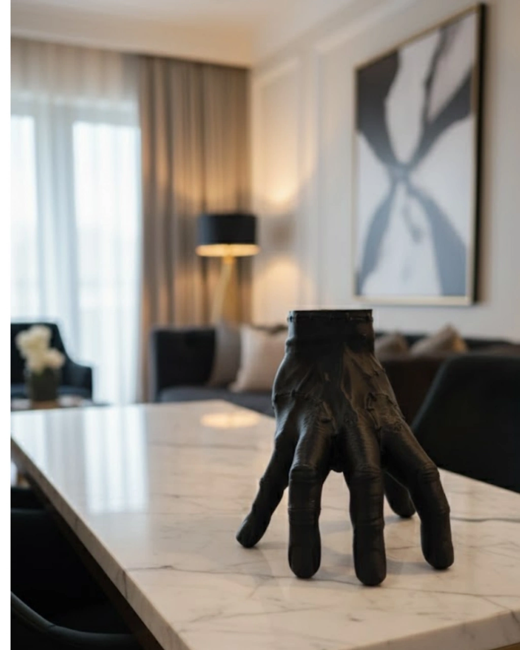 3D Siyah El Heykeli 17x16 cm, dekorasyonda cesur ve karakterli tercihler yapmak isteyenler için tasarlanmış özgün bir tasarım ürünüdür. Heykelsi yapısı sayesinde bulunduğu ortamda dikkat çekici bir atmosfer oluşturur.Kitaplık raflarında kitap aralarına yerleştirildiğinde sanatsal bir görünüm sağlar. Şömine üzerinde kullanıldığında dramatik ve estetik bir ambiyans yaratır. Çalışma masasında ise modern ve güçlü bir görünüm sunar.Mat siyah rengi, mekâna derinlik ve sofistike bir hava kazandırır. Açık renkli duvar önünde kontrast etkisi oluşturur; koyu tonlu dekorasyonlarda ise bütünleyici bir tamamlayıcı olur.Modern ev dekorasyonu, ofis dizaynı ve konsept alanlar için ideal bir tercihtir.