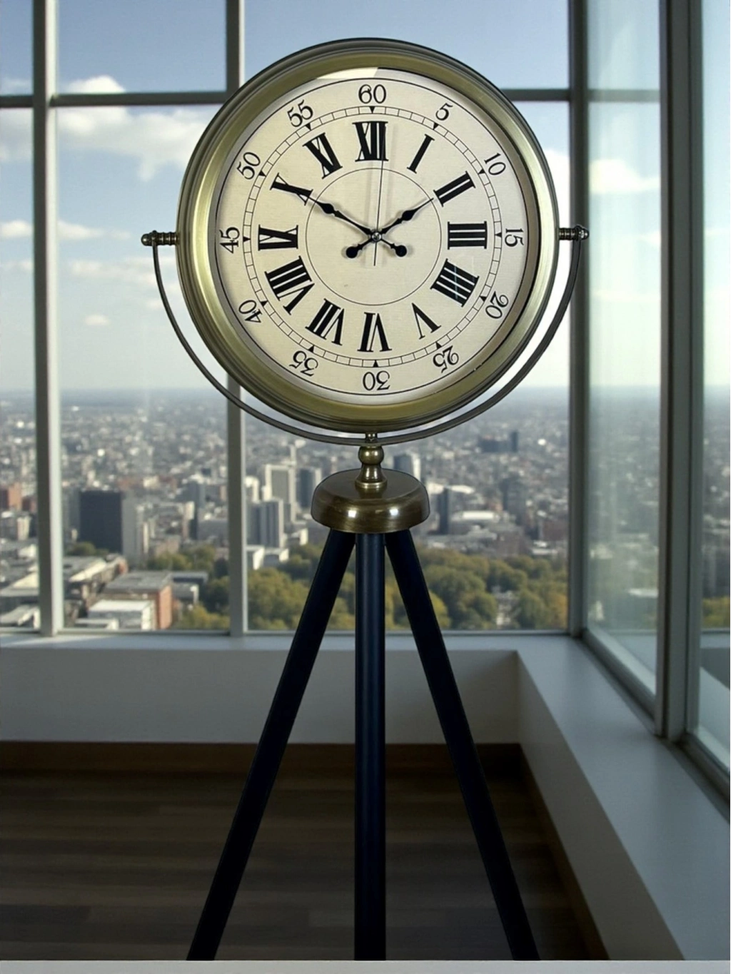 Zamanı yalnızca göstermekle kalmayıp bulunduğu ortama karakter katan bu eskitme tripod ayaklı yer saati, şık tasarımı modern dokunuşlarla birleştirerek yaşam alanlarınıza prestijli bir atmosfer kazandırır. Antik esintiler taşıyan metal gövdesi, zarif tripod ayak yapısı ve detaylı kadran tasarımıyla sıradan saatlerin çok ötesinde, başlı başına bir dekor objesidir.