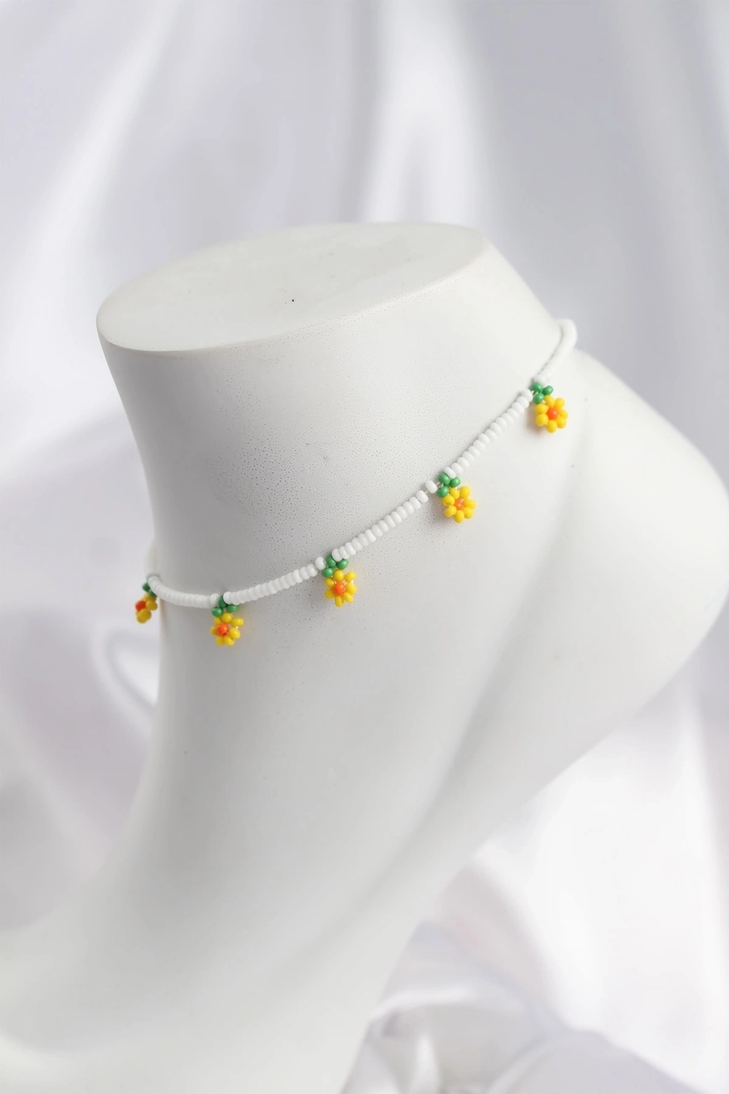 Beyaz Renk Boncuklu Papatya Motifli Halhal