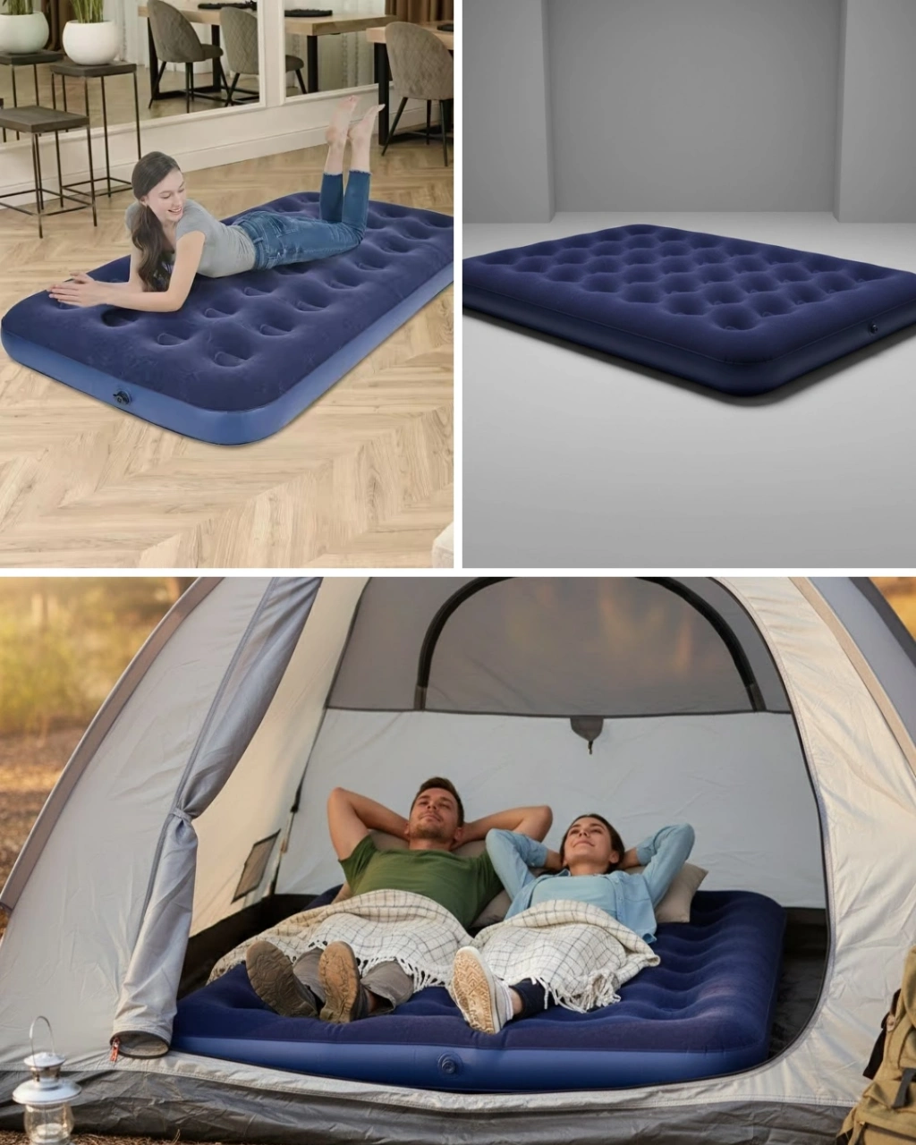Kamp ve doğa aktiviteleri için ideal olan bu çift kişilik şişme yatak, dayanıklı yapısı ve konforlu yüzeyiyle öne çıkar. Vinil gövdesi, dış mekân koşullarına karşı direnç gösterirken uzun süreli kullanım sağlar. Flokeli üst yüzeyi sayesinde rahat bir uyku deneyimi sunar.Sarmal kirişli iç yapı, yatağın formunu korumasına yardımcı olur ve vücut ağırlığını dengeli şekilde dağıtır. Vidalı vana sistemi ile hızlı şişirme ve boşaltma imkânı sunar. Hem kamp alanlarında hem de ev içinde misafir yatağı olarak rahatlıkla kullanılabilir.