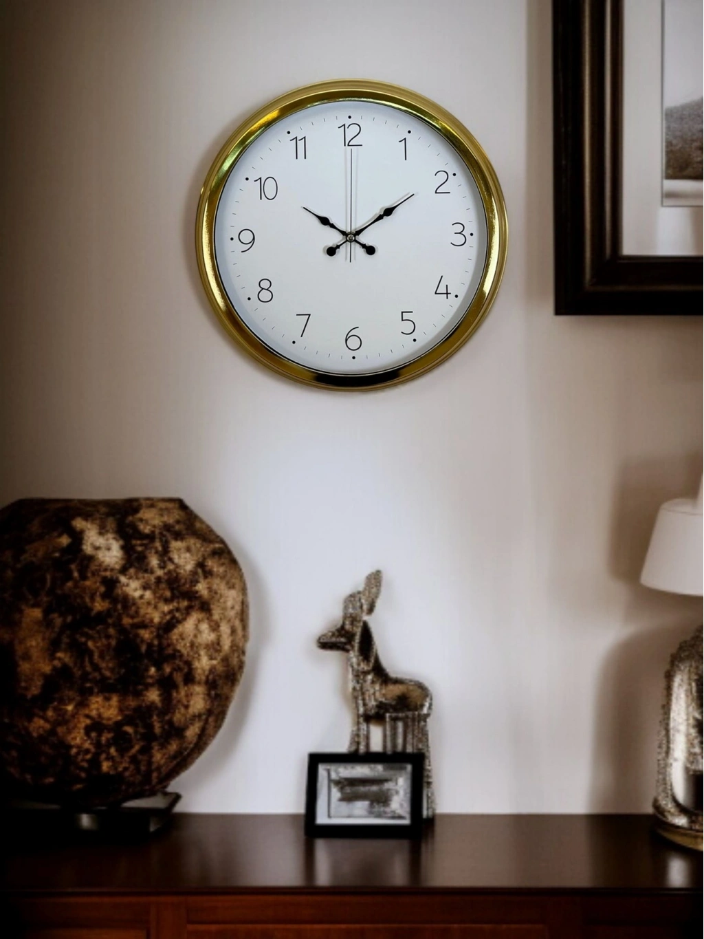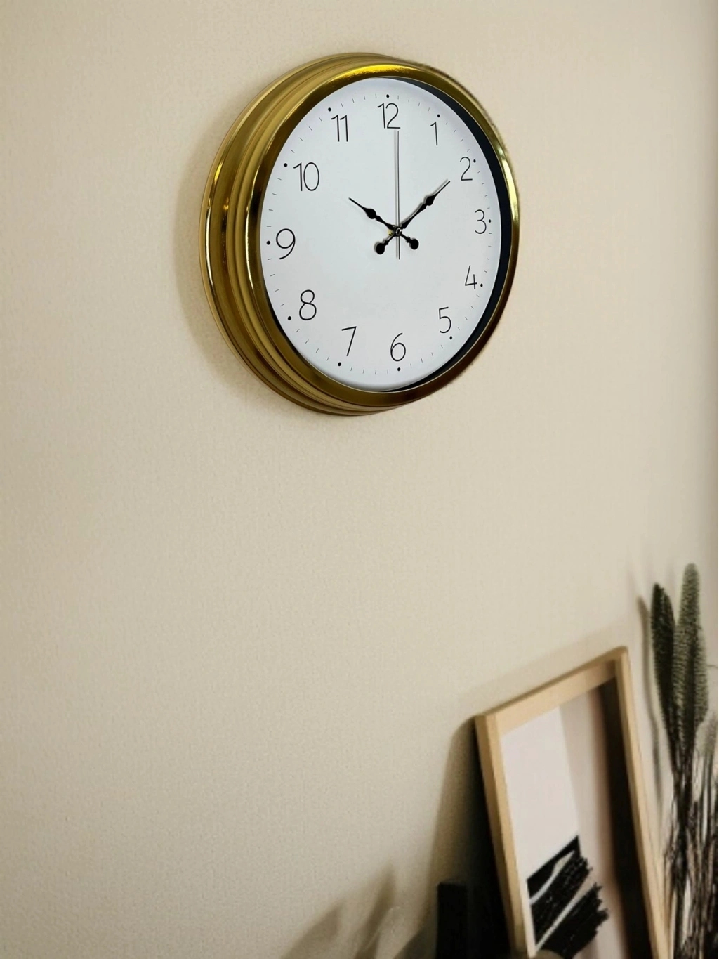 Modern tasarımı gold çerçevenin asil duruşuyla buluşturan bu 40 cm gold duvar saati, yaşam alanlarınıza zarif ve prestijli bir dokunuş katar. Ne çok büyük ne de küçük olan ideal ölçüsü sayesinde salon, oturma odası, ofis, mutfak, antre ve çalışma alanlarında rahatlıkla kullanılabilir.
