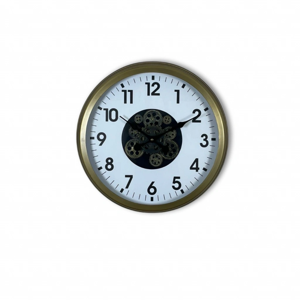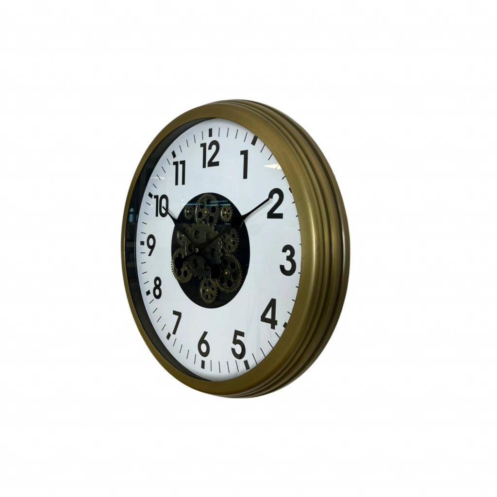 60 cm geniş çapı, eskitme gold çerçevesi ve merkezde yer alan dekoratif çark detaylarıyla bu duvar saati; hem klasik hem endüstriyel tarzı bir arada sunar.