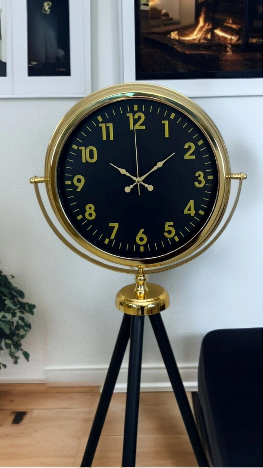 Gold metal çerçevesi ile siyah kadranın asil uyumu, saate lüks ve zamansız bir görünüm kazandırır. İnce formda tasarlanan siyah tripod ayakları, hem estetik hem de dengeli bir yapı sunarak saatin zeminde sağlam şekilde durmasını sağlar. Geniş ve sade kadran tasarımı, saatin uzaktan bile rahatlıkla okunmasına imkân tanır.