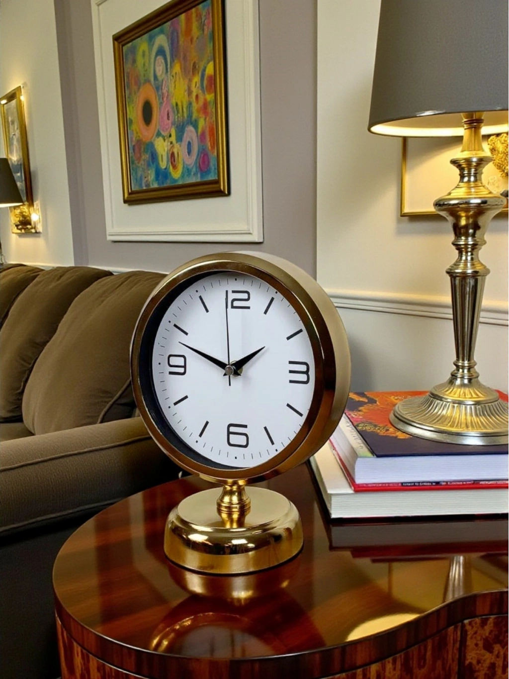 Parlak gold kaplaması ve sade beyaz kadranı ile öne çıkan bu masa saati, modern çizgilerle klasik estetiği bir araya getirir. Minimal rakam tasarımı sayesinde net ve kolay okunur bir kadran sunarken, bulunduğu ortama ferah ve şık bir görünüm kazandırır. Ofis masaları, salon konsolları, çalışma alanları ve kitaplıklar için dekoratif olduğu kadar işlevsel bir tamamlayıcıdır.