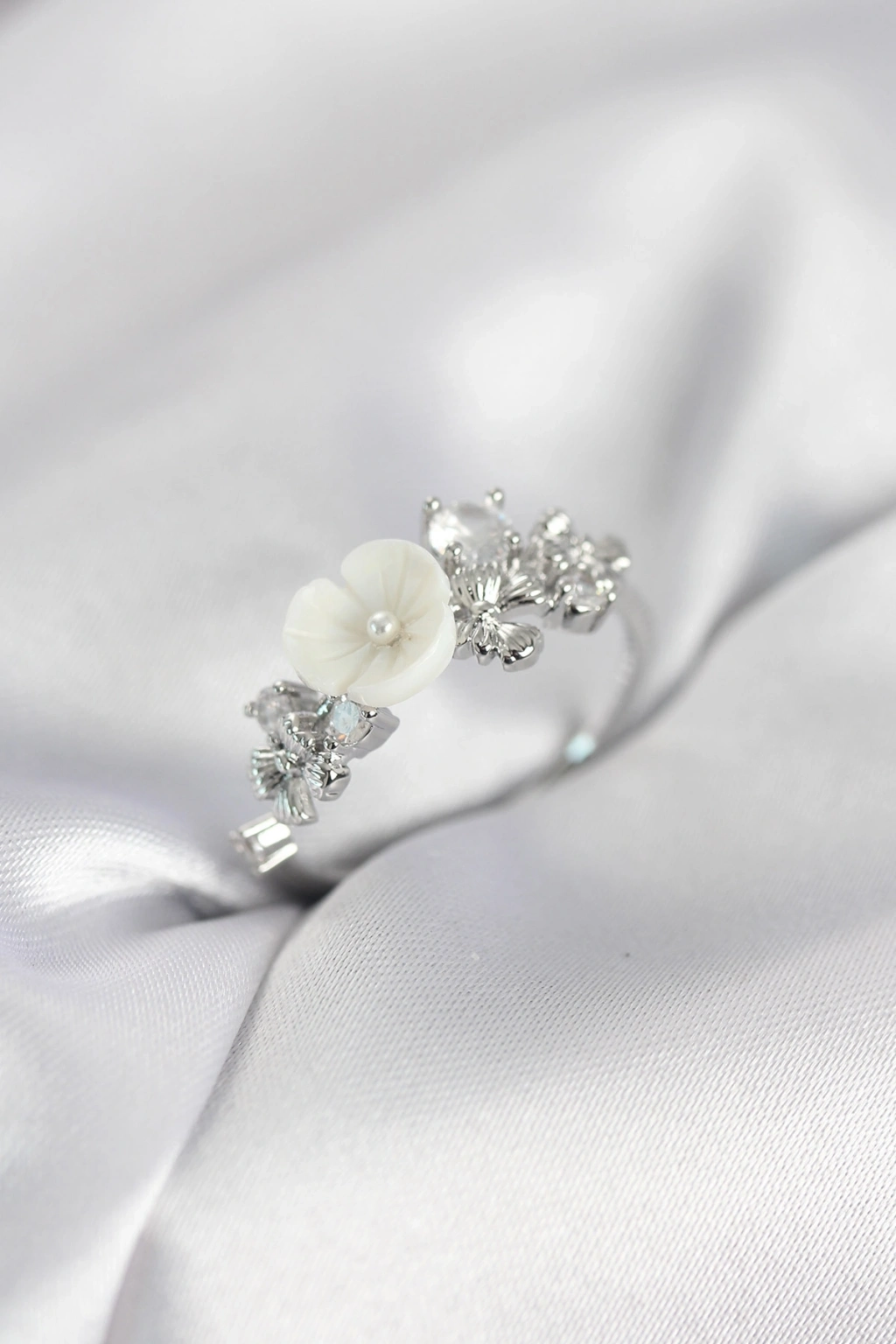 ® Gümüş Renk Pirinç Çiçek Model Zirkon Taşlı Kadın Yüzük