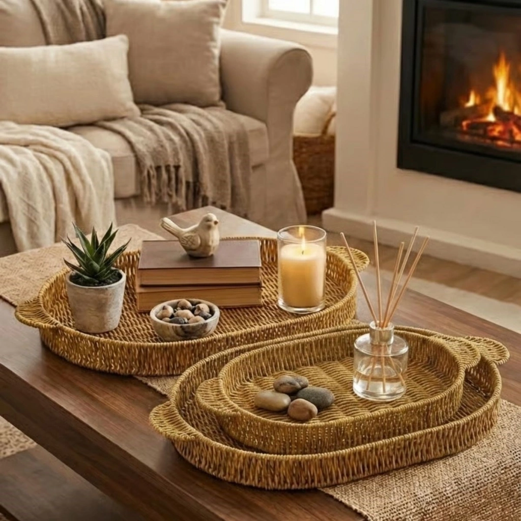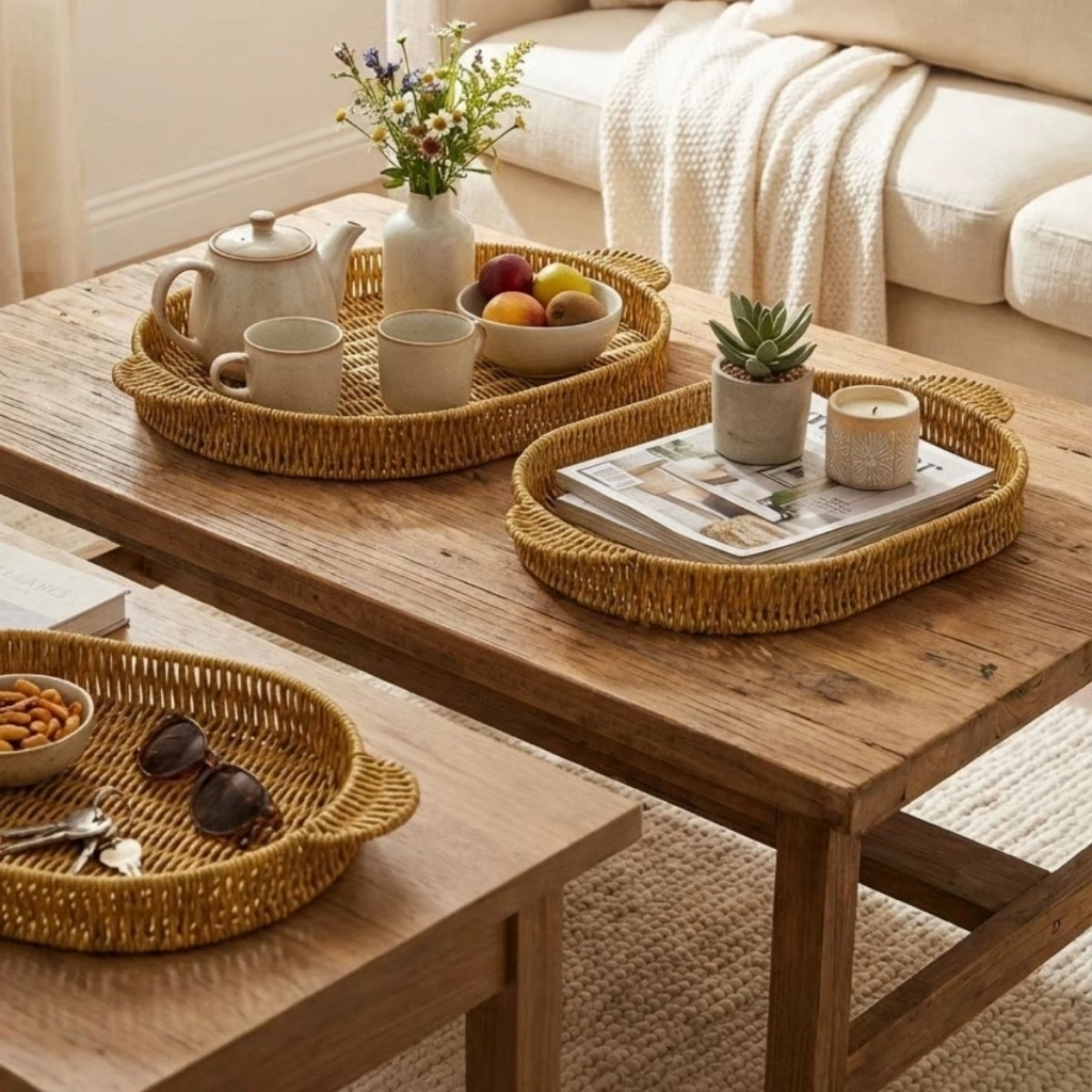 Dayanıklı plastik rattan malzemeden üretilen bu tepsi seti; kahvaltı, çay, kahve, ikram ve atıştırmalık sunumları için idealdir. Hafif ama sağlam yapısı sayesinde günlük kullanıma uygundur. Oval formu, masalarda yumuşak ve estetik bir görünüm oluştururken servis alanını verimli kullanmanıza yardımcı olur.