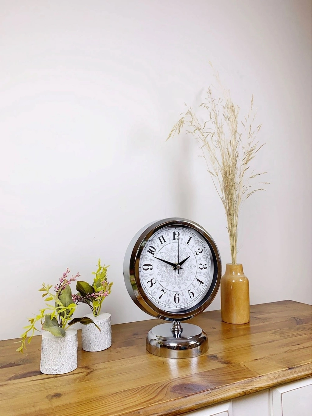 Şık ve modern tasarımıyla dikkat çeken krom kaplama masa saatimiz, sessiz akar saniye mekanizmasıyla konforlu bir kullanım sunar. Gerçek cam koruma paneli sayesinde uzun ömürlü ve dayanıklıdır. Estetik görünümüyle hem ev hem de iş yerleri için ideal bir dekoratif üründür.