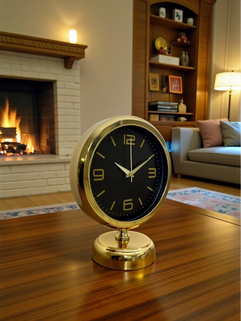 Modern çizgileri klasik bir duruşla buluşturan bu gold masa saati, siyah kadranı ve gold detaylarıyla bulunduğu her ortamda prestijli ve şık bir atmosfer oluşturur. Gözü yormayan sade tasarımı sayesinde hem ev hem de ofis dekorasyonlarında rahatlıkla kullanılabilir. Çalışma masasında güçlü ve profesyonel bir görünüm sunarken, salon konsolu veya raf üzerinde dekoru tamamlayan zarif bir aksesuar olarak öne çıkar.