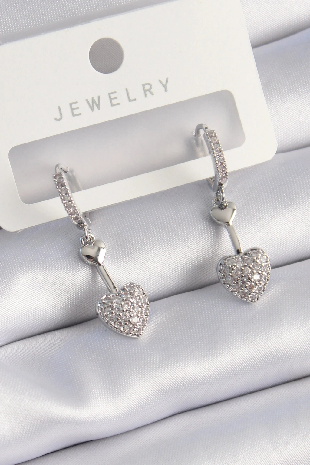 ® Pirinç Gümüş Renk Zirkon Taşlı Sallantı Kalp Model Kadın Küpe