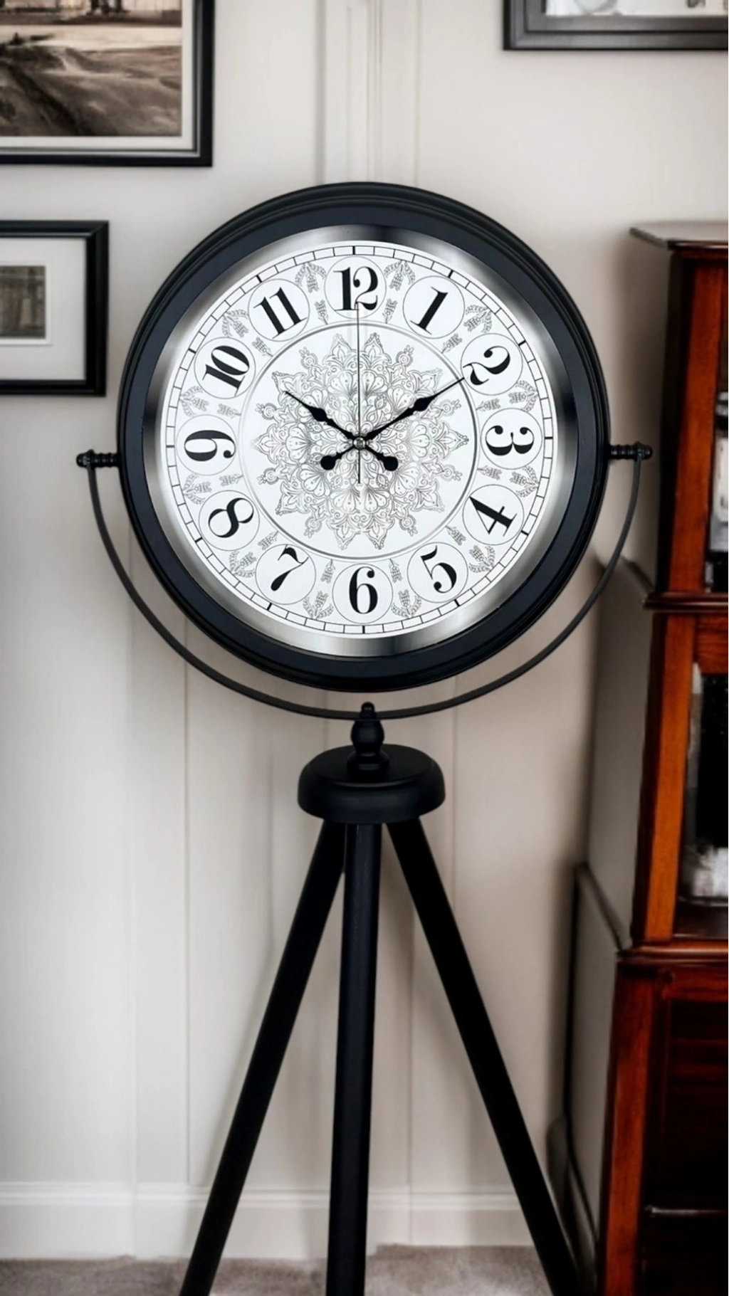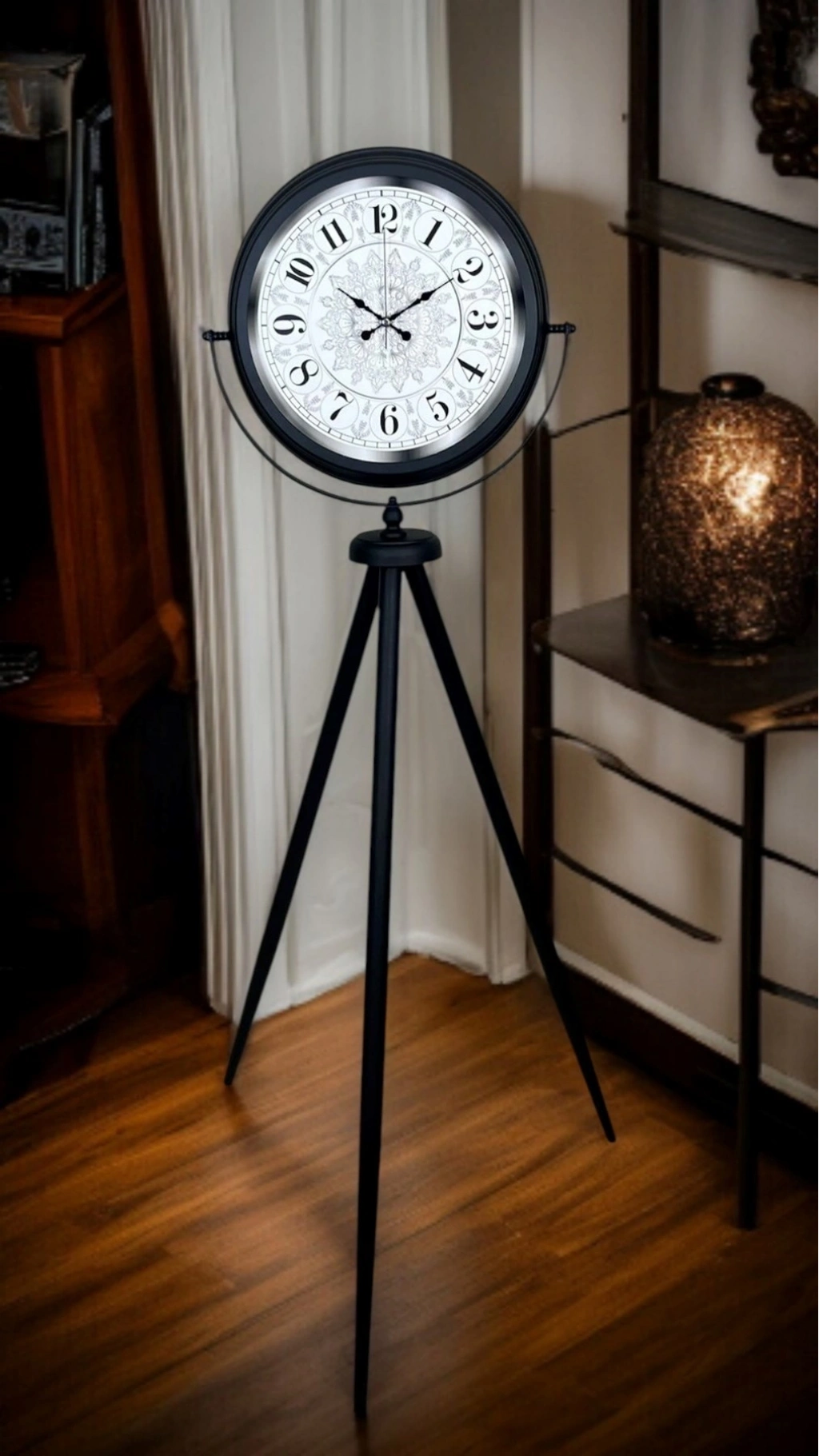 Zamansız tasarımı, güçlü duruşu ve dikkat çekici formu ile siyah tripod ayaklı dekoratif saat, klasik ve modern dekorasyonu bir araya getiren özel bir tasarım ürünüdür. Sıradan duvar veya masa saatlerinden farklı olarak ayaklı formu sayesinde bulunduğu ortamda dekoratif bir odak noktası oluşturur.