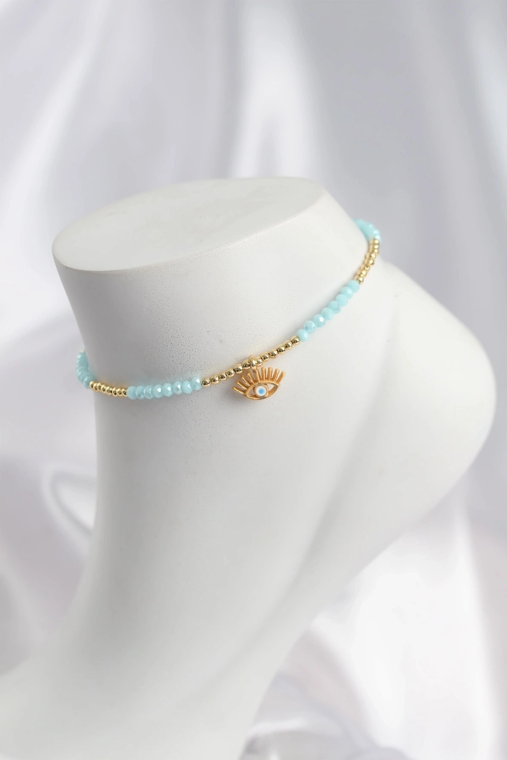 Turkuaz Renk Boncuklu Nazarlı Göz Figürlü Halhal