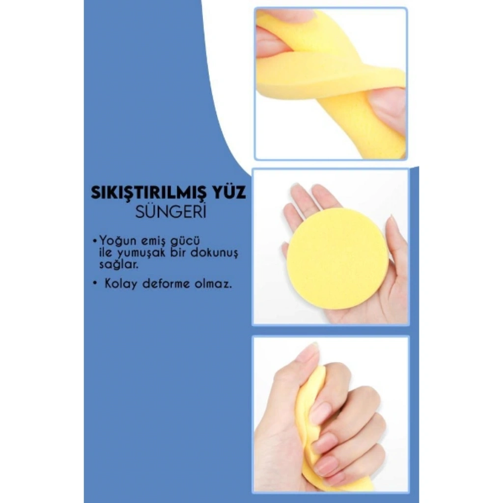 2'Lİ CİLT TEMİZLEME SÜNGERİ SETİÜrün Özellikleri2'li cilt temizleme süngeri seti, günlük yüz temizleme rutininizi daha etkili ve pratik hale getirmek için tasarlanmıştır. Yumuşak dokulu yapısı sayesinde cilt temizleme ürünleri ile birlikte kullanıldığında cildi nazikçe arındırmaya yardımcı olur. Sünger yüzeyi temizleme jelini veya köpüğünü eşit şekilde dağıtarak ciltte homojen temizlik sağlar. Yüz temizleme süngeri nemlendirildikten sonra üzerine temizleme ürünü uygulanarak köpürtülür ve oval hareketlerle cilde uygulanır. Ilık su ile durulandığında ciltte ferah ve temiz bir his bırakır. 2'li cilt temizleme süngeri set halinde sunulduğu için yedekli kullanım imkânı sağlar ve hijyen açısından avantaj sunar. Günlük bakım rutini için uygun olan cilt temizleme sünger seti, makyaj kalıntılarının ve gün boyu biriken kirin temizlenmesine destek olur.Ürün Teknik Özellikleri Özellik Açıklama Ürün Adı 2'li Cilt Temizleme Süngeri Seti Malzeme Yumuşak temizleme süngeri materyali Renk Görseldeki renklerden oluşan set Kullanım Alanı Yüz temizleme ve cilt bakımı Paket İçeriği2 adet cilt temizleme süngeri