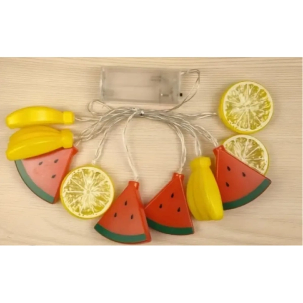 2M 10 LED KARIŞIK MEYVELER ŞEKİLLİ IŞIKÜrün Özellikleri2 metre uzunluğundaki 10 LED’li karışık meyve şekilli ışık dizisi, dekorasyonunuza eğlenceli ve renkli bir dokunuş katmak için tasarlanmıştır. Gün ışığı renginde yanan LED’ler, enerji tasarruflu yapısıyla hem iç mekanda hem de parti, doğum günü ve konsept çekimlerde hoş bir ambiyans oluşturur. Dize üzerinde karpuz, limon ve muz gibi farklı meyve figürleri bulunur ve her bir meyve yaklaşık 6 cm boyutundadır. Ürün 2 fonksiyonlu olup sabit yanma ve yanıp sönme modlarıyla kullanım çeşitliliği sunar. Pilli çalışma sistemi sayesinde pratik bir şekilde her yerde kullanılabilir ve görsel olarak dikkat çekici, canlı bir dekoratif aydınlatma sağlar.Paket İçeriği1 Adet 2m 10 Led Karışık Meyveler Şekilli Işık Dizesi