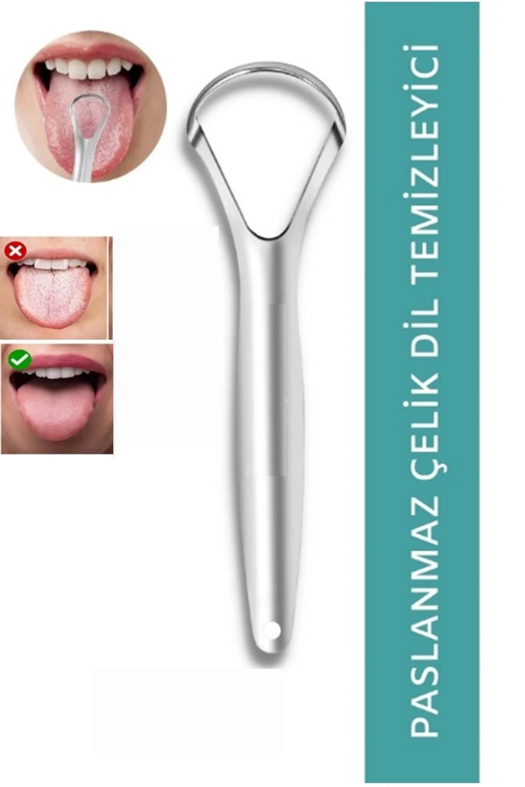 PASLANMAZ ÇELİK DİL TEMİZLEYİCİAğız hijyeninizi bir üst seviyeye taşıyan paslanmaz çelik dil temizleyici, ağız kokusunu azaltmaya ve genel ağız sağlığınızı iyileştirmeye yardımcı olur. Ergonomik tasarımı sayesinde kullanımı kolaydır ve dil üzerindeki bakterileri etkili bir şekilde temizler.Ürün Özellikleri: • Yüksek Kalite Paslanmaz Çelik: Uzun ömürlü ve dayanıklı malzemesiyle paslanmaya karşı dirençlidir. Kolayca temizlenebilir ve hijyenik kalır. • Ergonomik Tasarım: Elinize rahatça oturur ve dil yüzeyine zarar vermeden nazikçe temizler. • Etkili Temizlik: Dil üzerindeki bakterileri, kalıntıları ve kötü kokuları gidermeye yardımcı olur, ağız hijyenini geliştirir. • Kolay Kullanım: Her sabah ve akşam, dişlerinizi fırçaladıktan sonra dilinizin yüzeyinde nazikçe kaydırarak kullanın. • Çevre Dostu: Plastik atık oluşturmaz, uzun süreli kullanıma uygundur.Kullanım Talimatları: 1. Temizleyiciyi su ile durulayın. 2. Dilinizin arka kısmına yerleştirin ve öne doğru nazikçe kaydırın. 3. Her kullanımdan sonra su ile iyice temizleyin ve kurulayın.Uyarılar: • Çok fazla baskı uygulamaktan kaçının. • Çocukların erişemeyeceği yerlerde saklayın. • Kişisel hijyen ürünü olduğu için kişisel kullanım içindir.Faydaları: • Ağız kokusunu azaltır. • Ağız hijyenini geliştirir. • Diş etlerini ve diş sağlığını korur.
