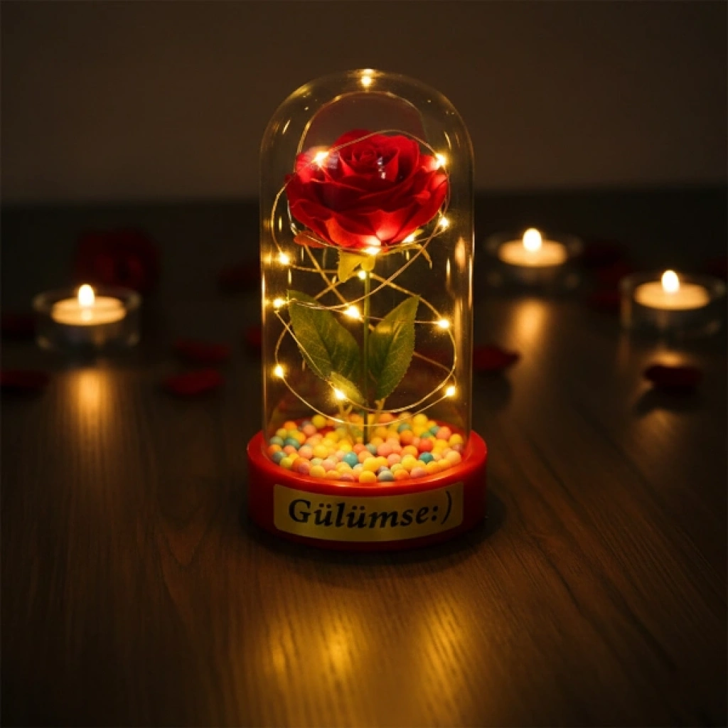 RENKLİ TOPLU LEDLİ GÜL FANUSÜrün ÖzellikleriRenkli toplu ledli gül fanus, canlı detayları ve sıcak ışık etkisiyle dekorasyona enerjik ve romantik bir hava katan şık bir üründür. Şeffaf fanus içerisinde yer alan tekli yapay gül, taban kısmındaki renkli toplar ile birlikte görsel olarak dikkat çekici bir bütünlük sunar. Sahip olduğu gün ışığı LED aydınlatma sayesinde yumuşak ve huzur verici bir ışık yayarak masa, komodin ve raf üzerinde estetik bir ambiyans oluşturur. Kompakt ölçüsüyle yer kaplamadan kullanılabilen bu model, özellikle özel günlerde dekoratif gül fanus arayanlar için ideal bir tercihtir. Model seçimi yapılamayan ürün, görsellerde yer alan tasarımlardan biri olacak şekilde karışık model gönderimi yapılmaktadır.Ürün Teknik Özellikleri Özellik Açıklama Ürün Adı Renkli Toplu Ledli Gül Fanus Boyut 10 x 18 cm Aydınlatma Gün ışığı LED Tasarım Şeffaf fanus, tekli gül Detay Taban kısmında renkli toplar Model Karışık gönderilir Kullanım Alanı Masa, komodin, raf Kullanım Amacı Dekoratif ve hediyelik Paket İçeriği1 adet renkli toplu ledli gül fanus