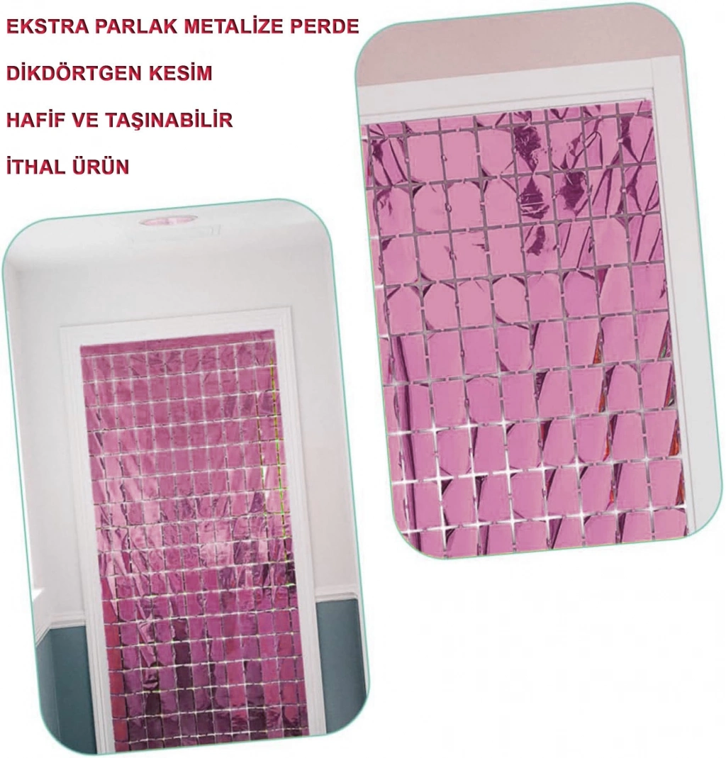 ROSE GOLD DİSKO DİKDÖRTGEN KESİM KAPI PERDESİÜrün ÖzellikleriRose Gold Disko Dikdörtgen Kesim Kapı Perdesi, modern ve ışıltılı görünümü ile organizasyon dekorasyonlarında dikkat çekici bir atmosfer oluşturur. 1x2 metre ölçüsü sayesinde kapı girişlerinde, sahne arka planlarında ve fotoğraf çekim alanlarında rahatlıkla kullanılabilen rose gold kapı perdesi, metalize folyo yapısı ile ışığı yansıtarak ortama parlak bir görünüm kazandırır. Şık ve zarif tonuyla öne çıkan metalize parti perdesi, doğum günü, düğün, nişan ve yılbaşı gibi özel etkinliklerde dekoratif tamamlayıcı olarak tercih edilebilir. Dikdörtgen kesim tasarımı sayesinde düzenli ve estetik bir duruş sergileyen disko fon perdesi, farklı konsept dekorasyonlara uyum sağlar. Hafif yapısı sayesinde kolay konumlandırılabilir ve dekor alanlarında pratik kullanım sunar.Ürün Teknik Özellikleri Özellik Açıklama Ürün Adı Rose Gold Disko Dikdörtgen Kesim Kapı Perdesi Boyut 1 x 2 Metre Renk Rose Gold Malzeme Metalize Folyo Kesim Tipi Dikdörtgen Paket İçeriği1 Adet Rose Gold Disko Dikdörtgen Kesim Kapı Perdesi