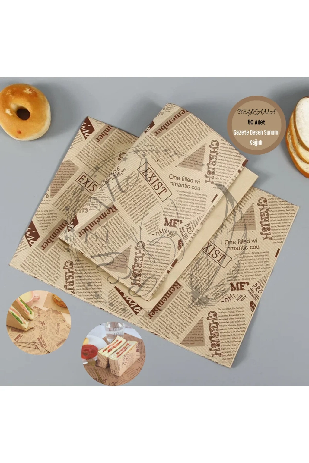 VINTAGE GAZETE DESENLİ SUNUM KAĞIDI 50 ADETZamansız Şıklık ve PratiklikYemek sunumunuza nostaljik bir dokunuş katın ve sunumlarınızı benzersiz kılın! Vintage gazete desenli sunum kağıdı, hem göz alıcı bir estetik sunar hem de kullanım kolaylığı sağlar. Bu özel tasarım yağlı kağıt, dayanıklı yapısı ve su geçirmez özelliği sayesinde sandviç, hamburger ve diğer lezzetli yiyeceklerinizi güvenle sararak sunmanızı mümkün kılar. Retro gazete desenleri ile sofralarınıza klasik bir hava katan bu ürün, aynı zamanda hijyenik ve gıda temasına uygun malzemelerden üretilmiştir.Yemek sunumu konusunda yenilikçi çözümler arayanlar için ideal olan bu sunum kağıdı, kafe, restoran ve ev kullanımı için mükemmel bir seçimdir. Sandviçlerinizi, kurabiyelerinizi ve diğer aperatiflerinizi bu şık kağıtlarla sarmak, misafirlerinize ve müşterilerinize unutulmaz bir deneyim sunmanızı sağlar. Kolayca katlanabilir ve kesilebilir yapısıyla pratik bir kullanım sunan vintage gazete desenli sunum kağıdı, aynı zamanda çevre dostu ve geri dönüştürülebilir materyallerden üretilmiştir.Sofralarınıza geçmişin büyüsünü taşıyan bu zarif ürün, stil ve işlevselliği bir araya getirerek, yemek sunumunuza farklı bir boyut kazandırır. Özel etkinliklerde, günlük sunumlarda ya da paket serviste rahatlıkla kullanabileceğiniz vintage gazete desenli sunum kağıdı, mutfağınızın vazgeçilmez bir parçası olacak. Nostaljinin şıklığını ve pratikliğini bir arada sunan bu eşsiz kağıtlarla, yemek sunumlarınızı sıradanlıktan çıkarın ve her anınızı özel kılın.Paket İçeriği50 adet vintage gazete desenli sunum kağıdı