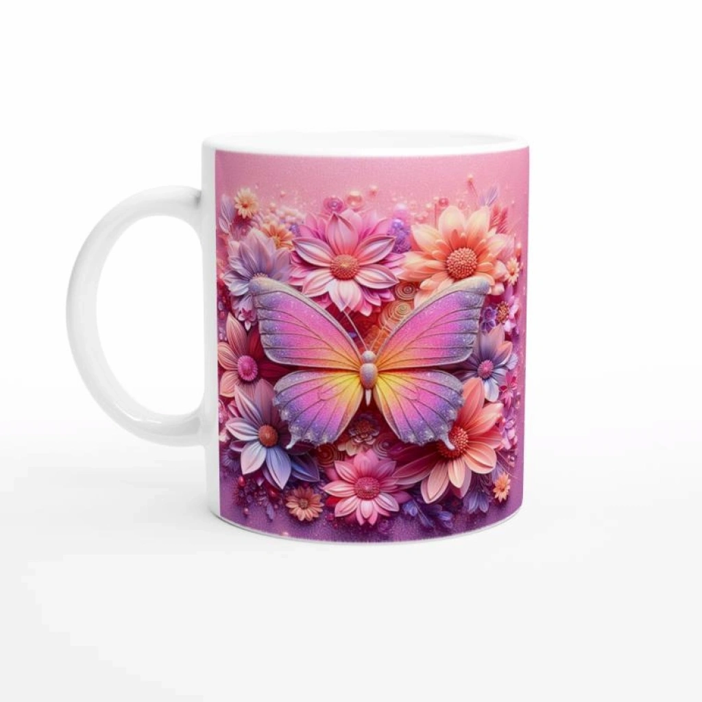 Işıltılı Çiçekler Arasında Renkli Kelebek Temalı Baskılı Kupa Bardak, ışıltılı pembe arka planı ve detaylı çiçek desenleriyle iç ısıtan bir atmosfer sunuyor. Doğanın büyüsünü yaşam alanına taşımak isteyenler için eşsiz bir tercih.
